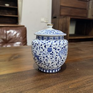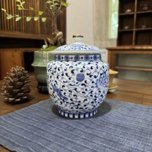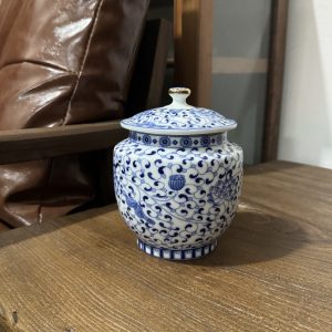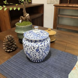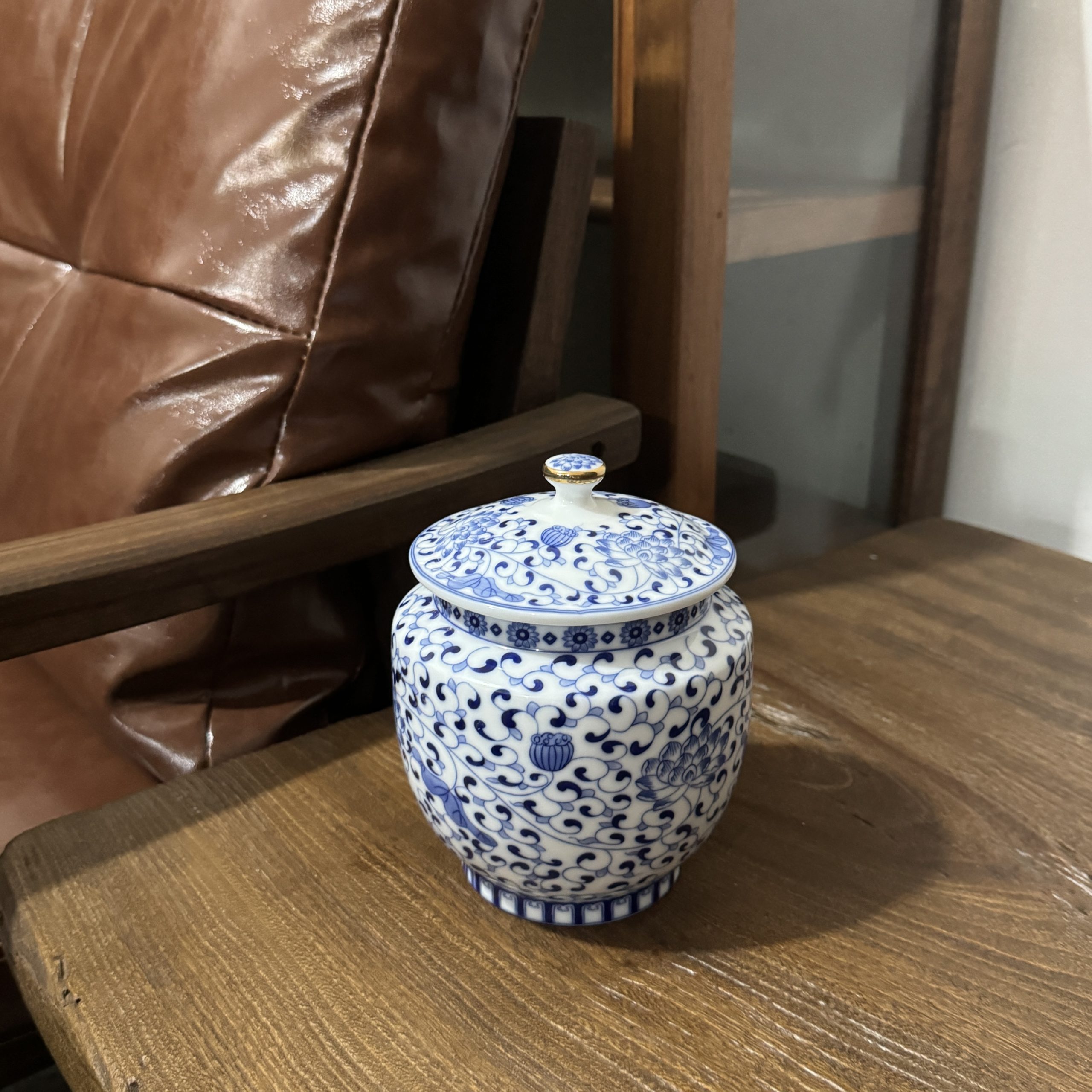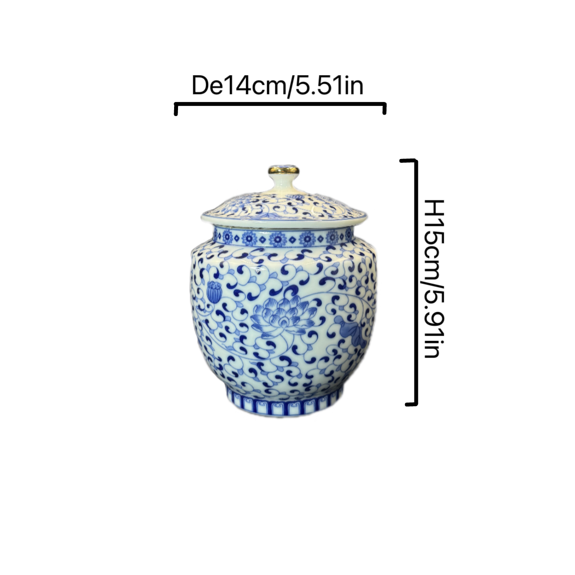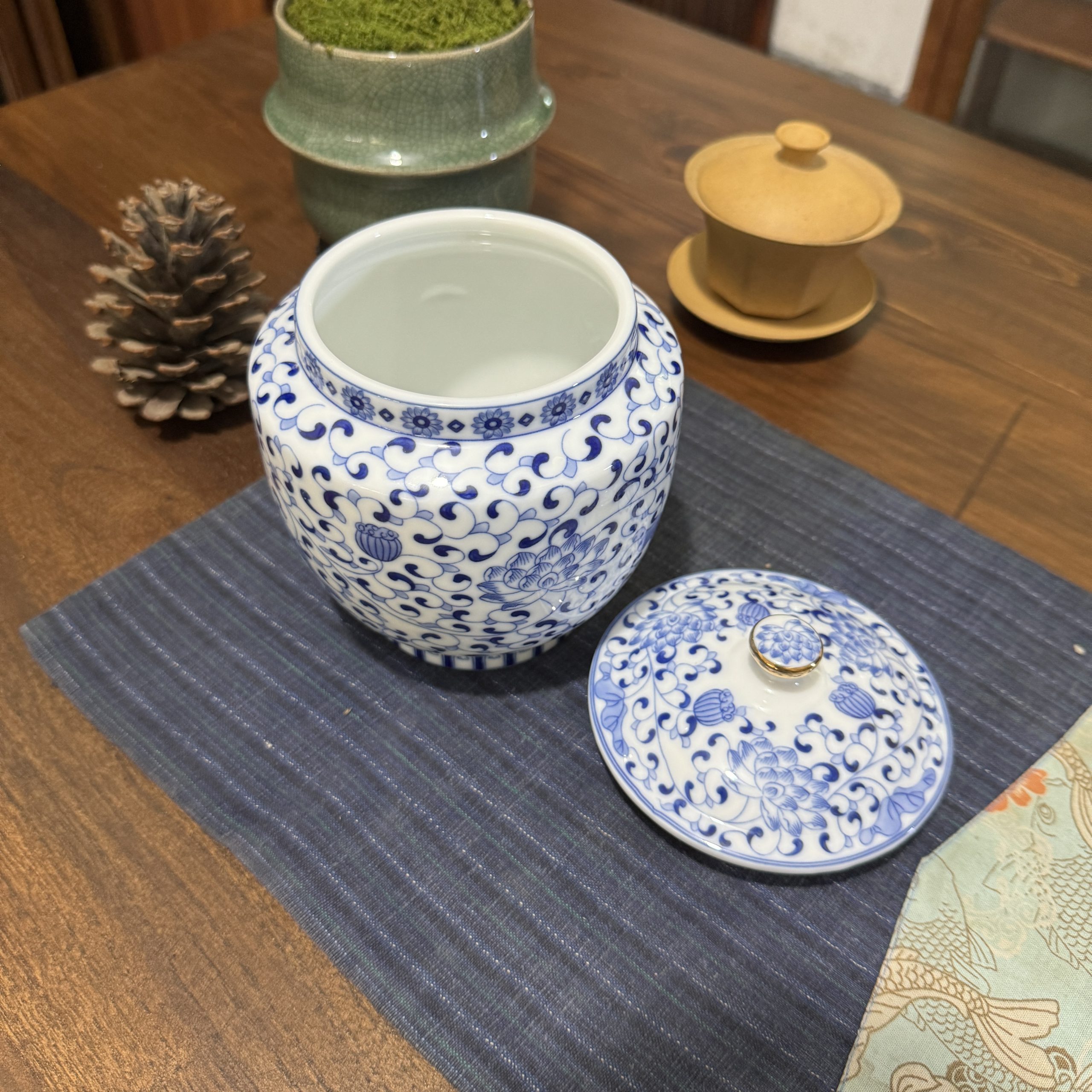 Elevate your tea storage with this blue and white porcelain jar featuring intricate lotus scroll patterns. Perfect for preserving tea freshness while adding traditional Chinese elegance to your space.