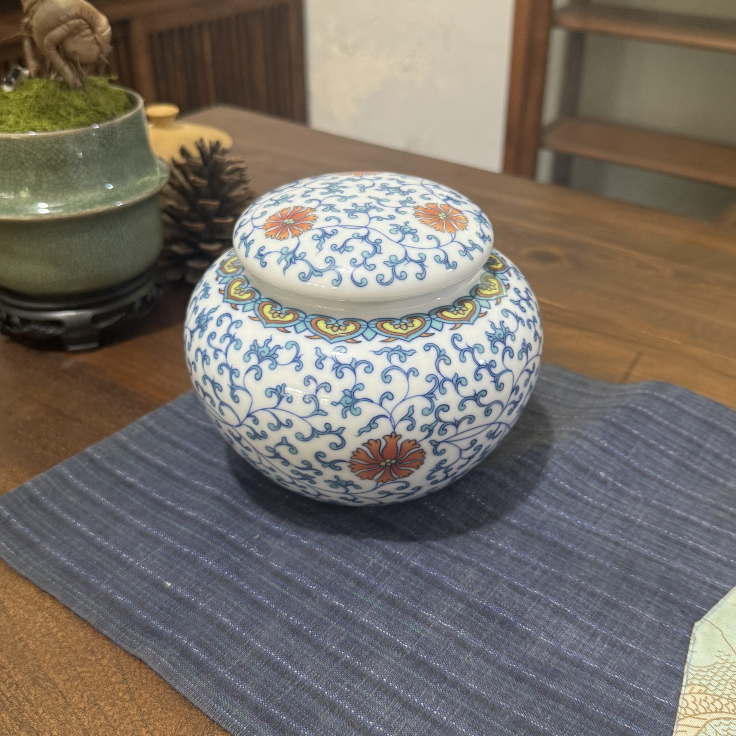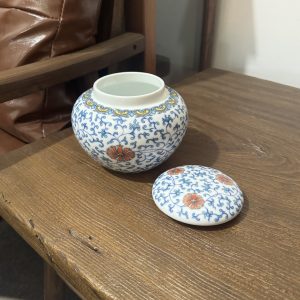 Chinese Blue and White Ceramic Tea Storage Jar with Floral Scroll & Orange Flower Patterns