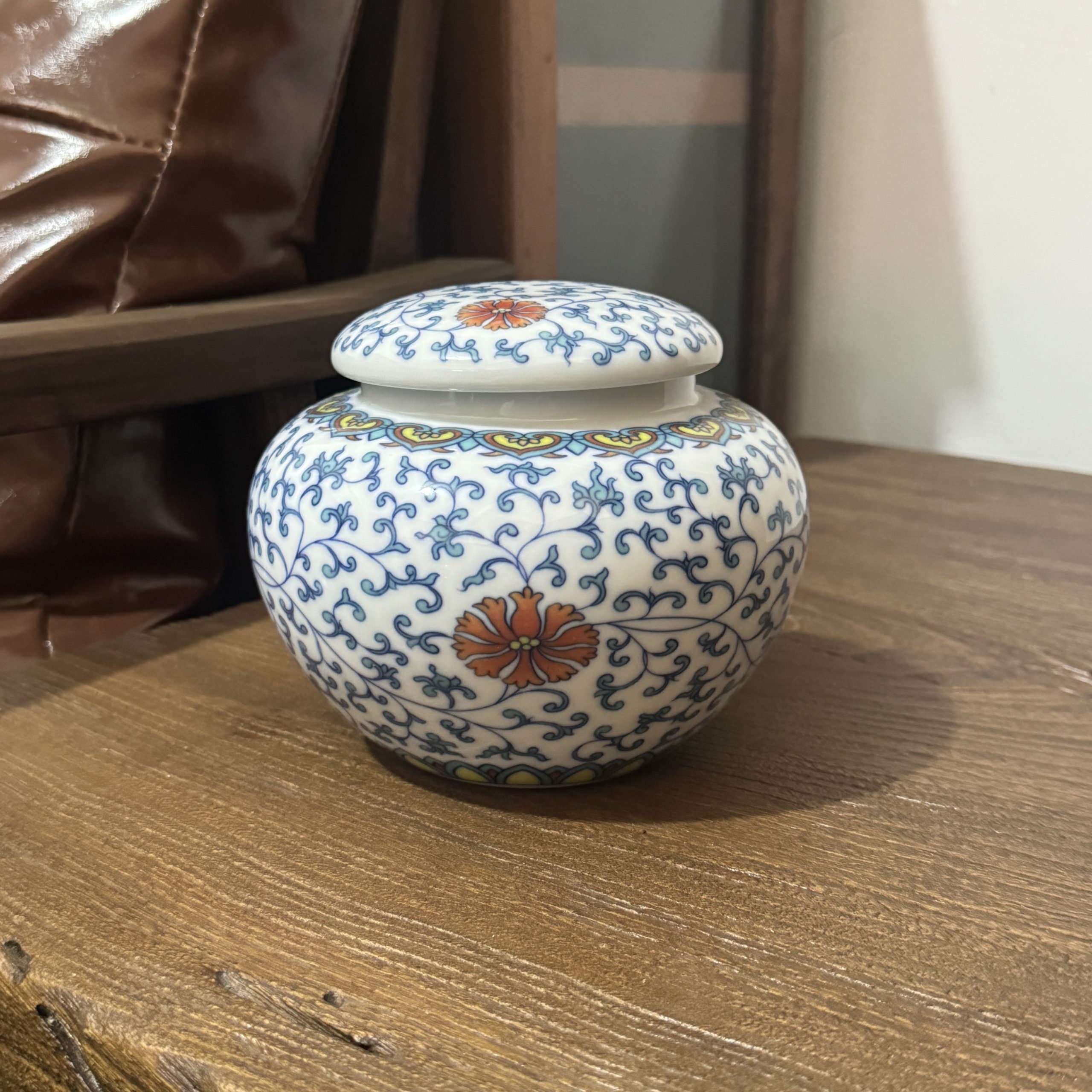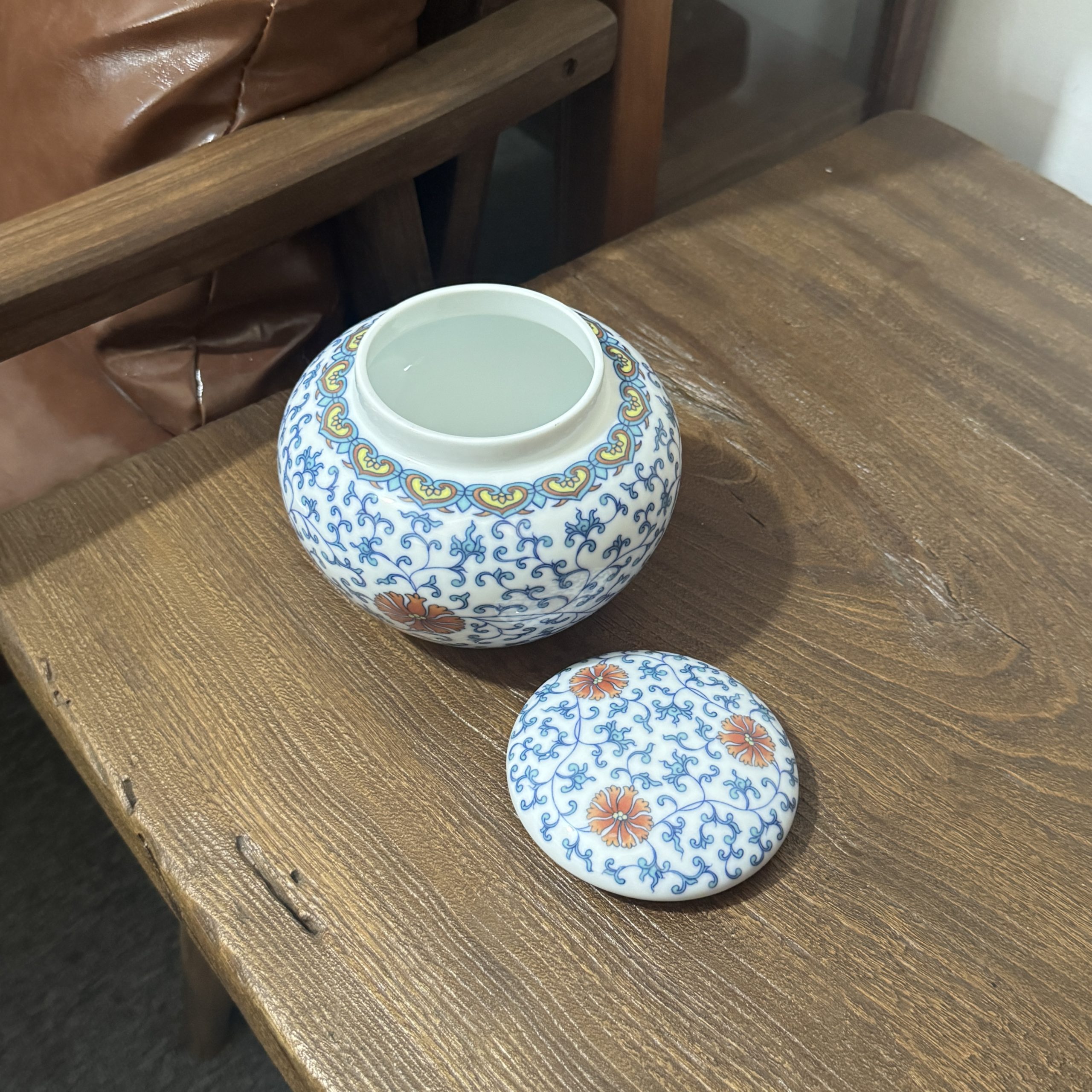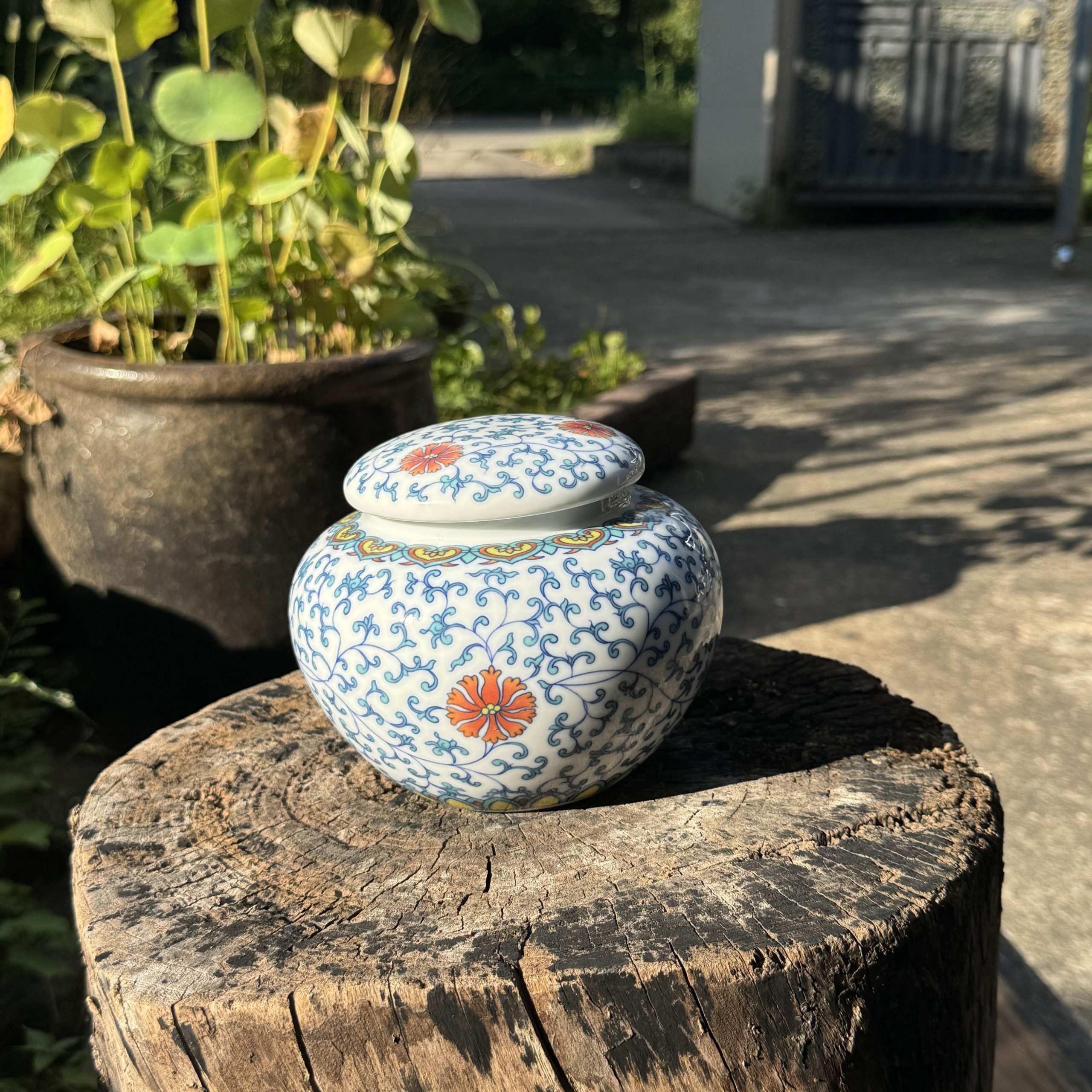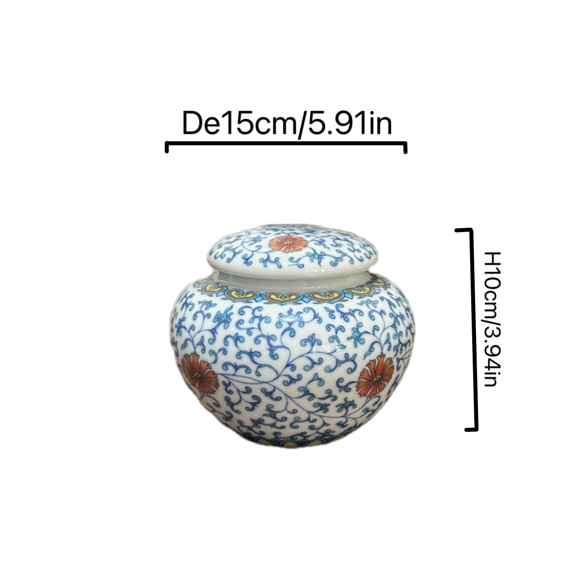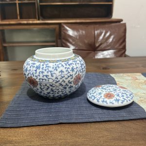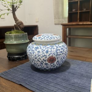 Elevate tea storage or home decor with this Chinese blue and white ceramic jar, featuring intricate floral scrolls and vibrant orange flower accents. Perfect for keeping tea fresh while infusing traditional oriental elegance.