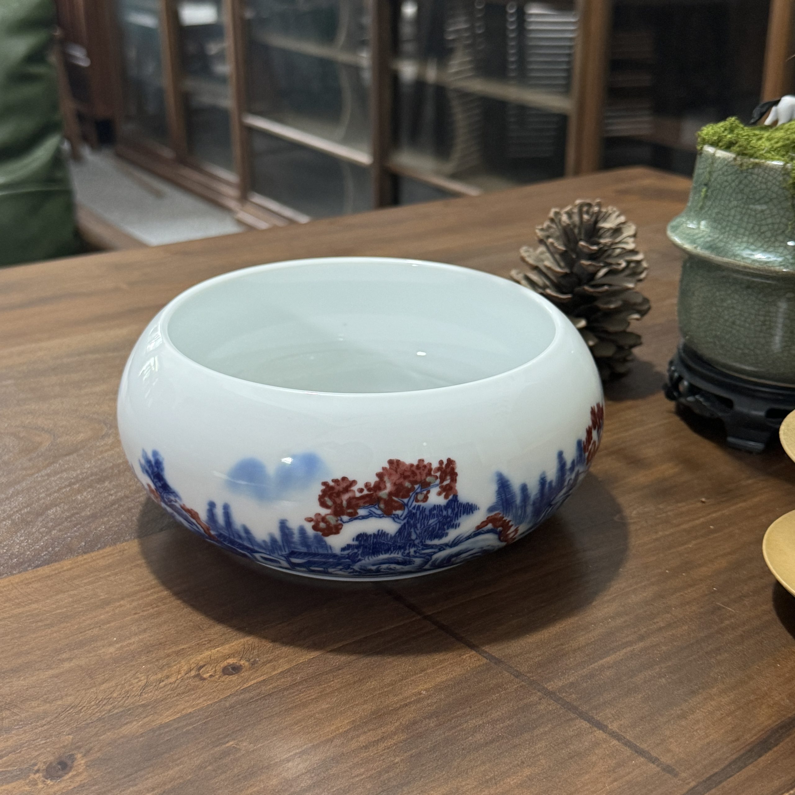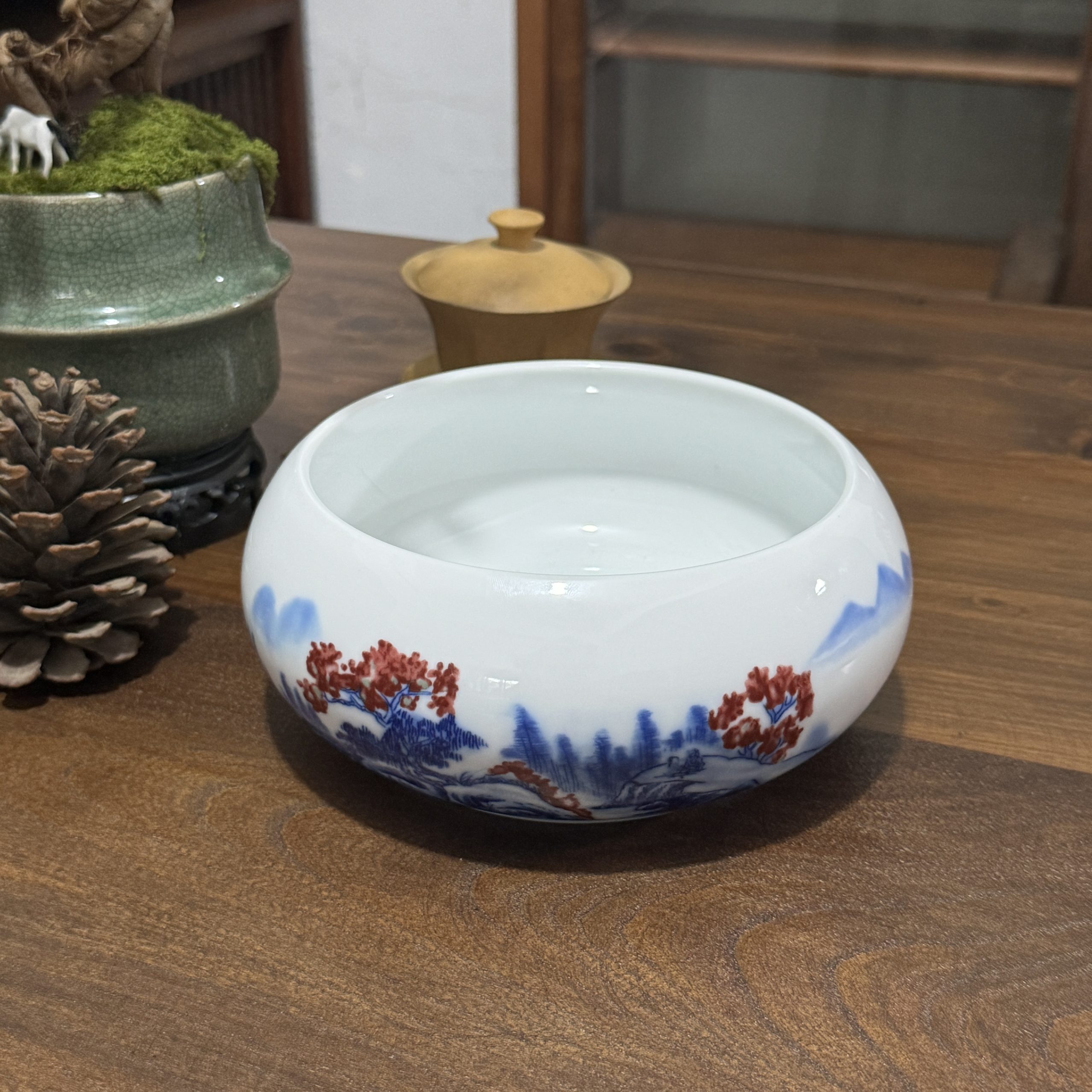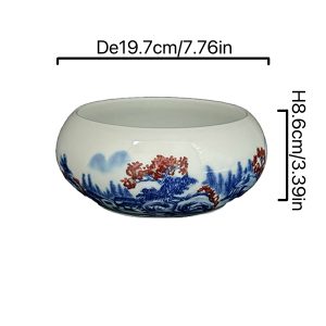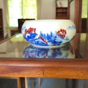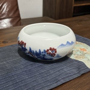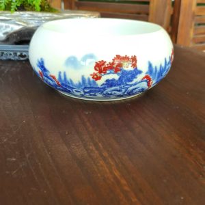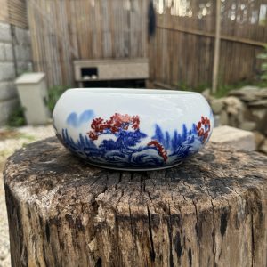 Chinese Ceramic Bowl with Blue & Red Landscape Patterns – Elegant Home & Tea Decor