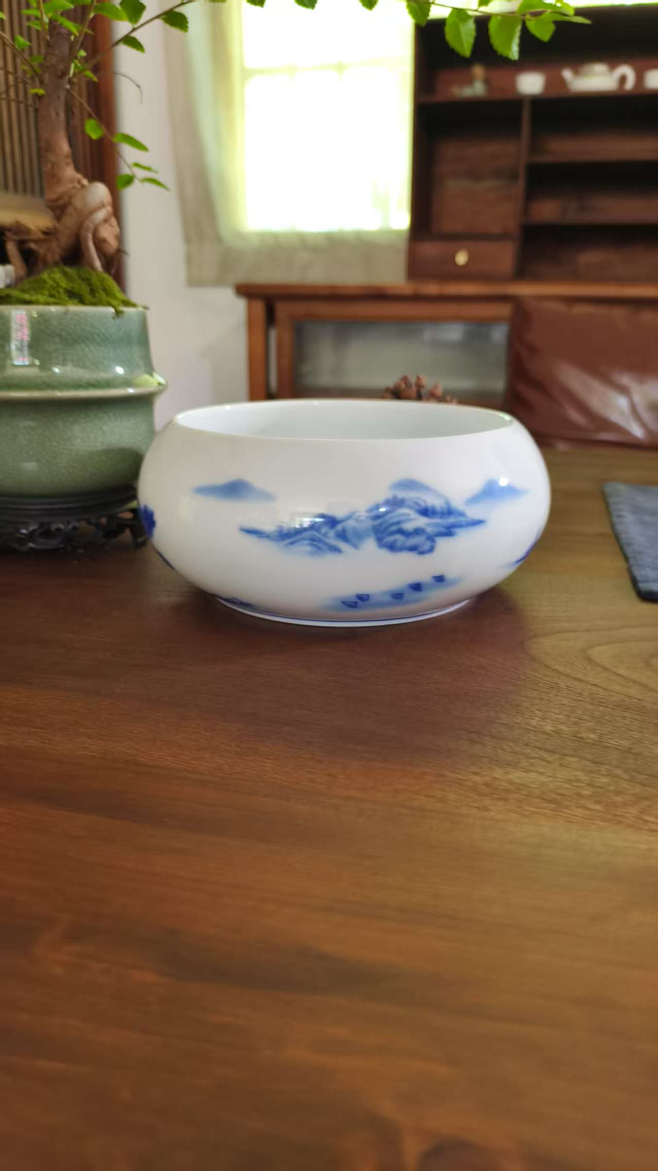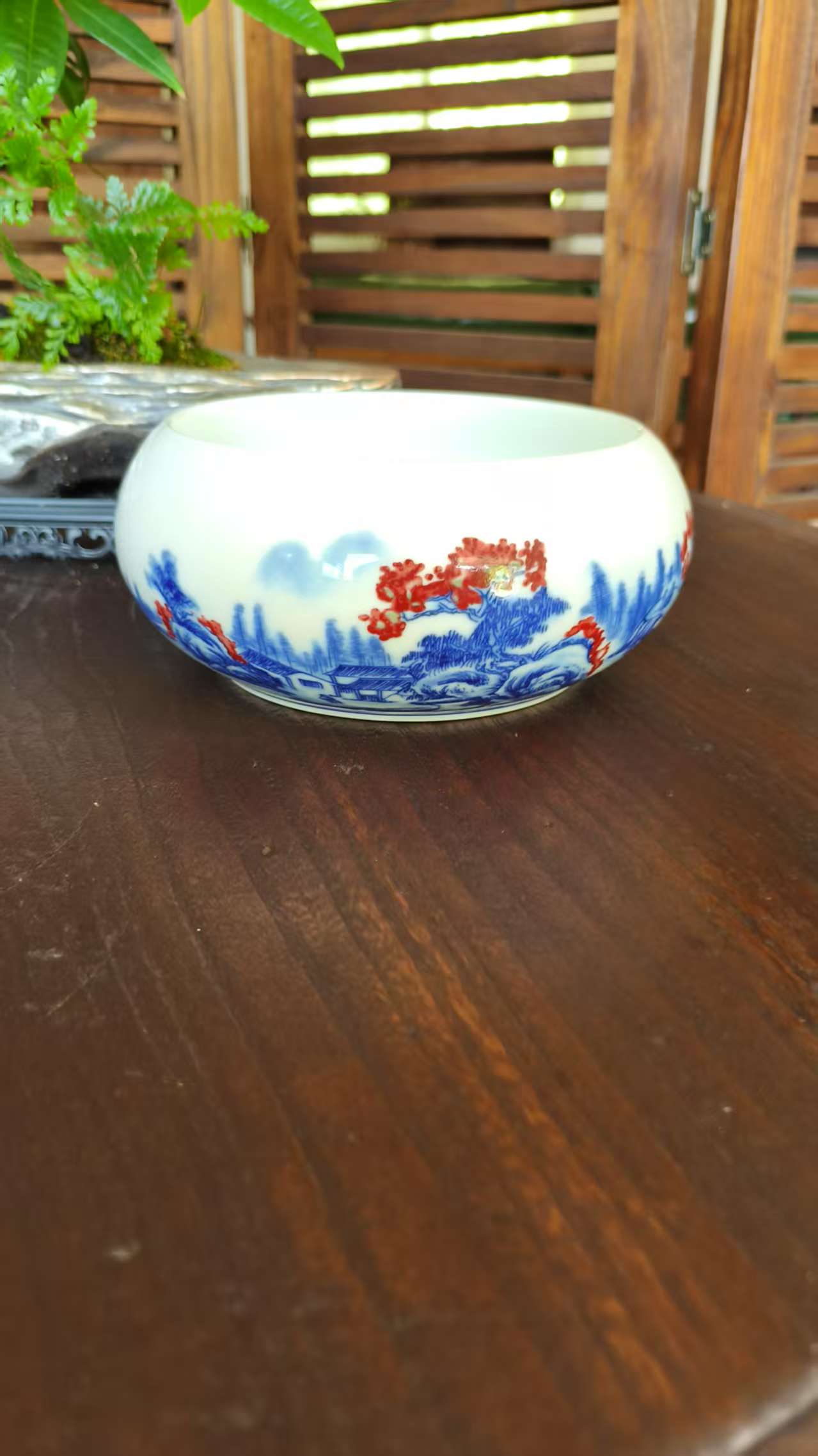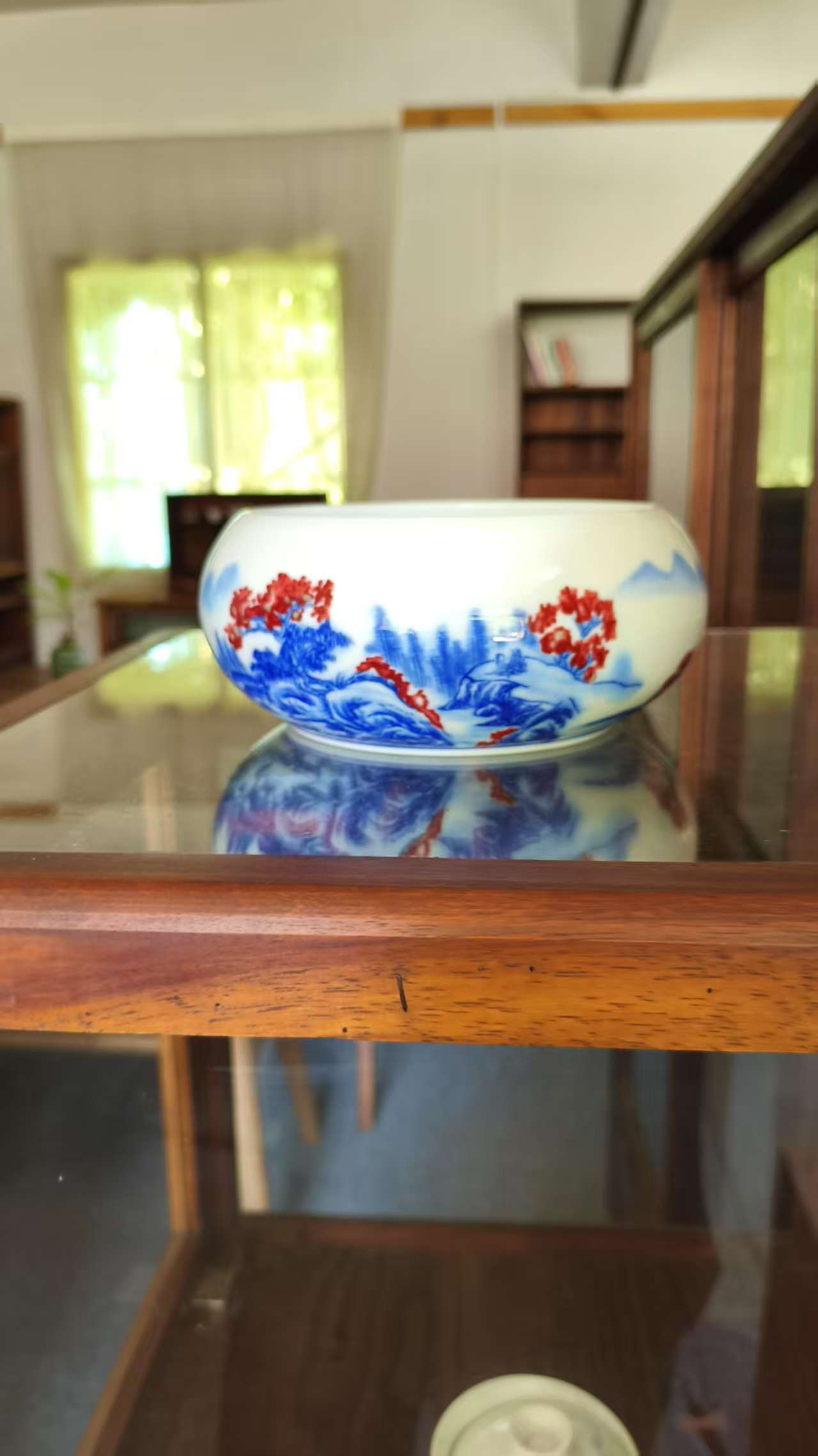 Chinese Ceramic Bowl with Blue & Red Landscape Patterns – Elegant Home & Tea Decor