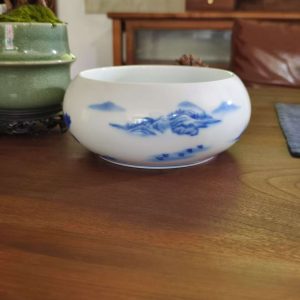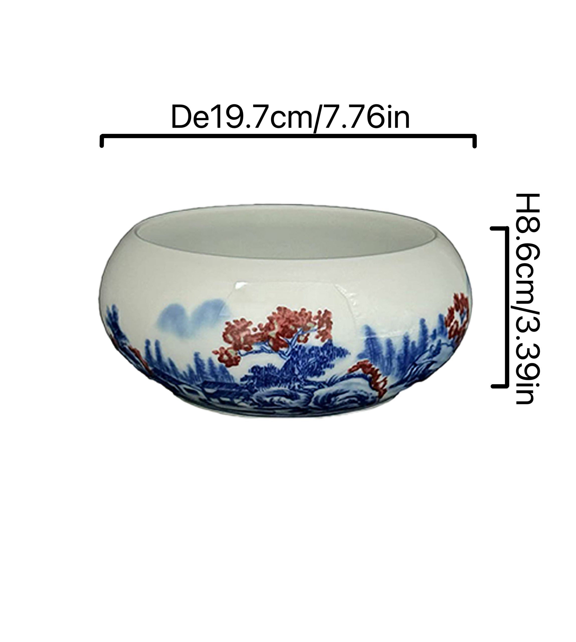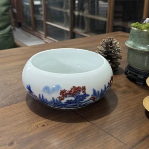 Bring traditional Chinese elegance to your space with this white ceramic bowl, featuring intricate blue and red landscape patterns. Perfect for home decor or as a vessel in tea ceremonies.