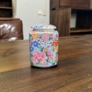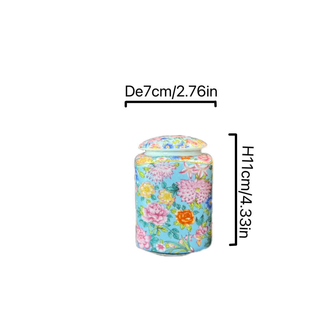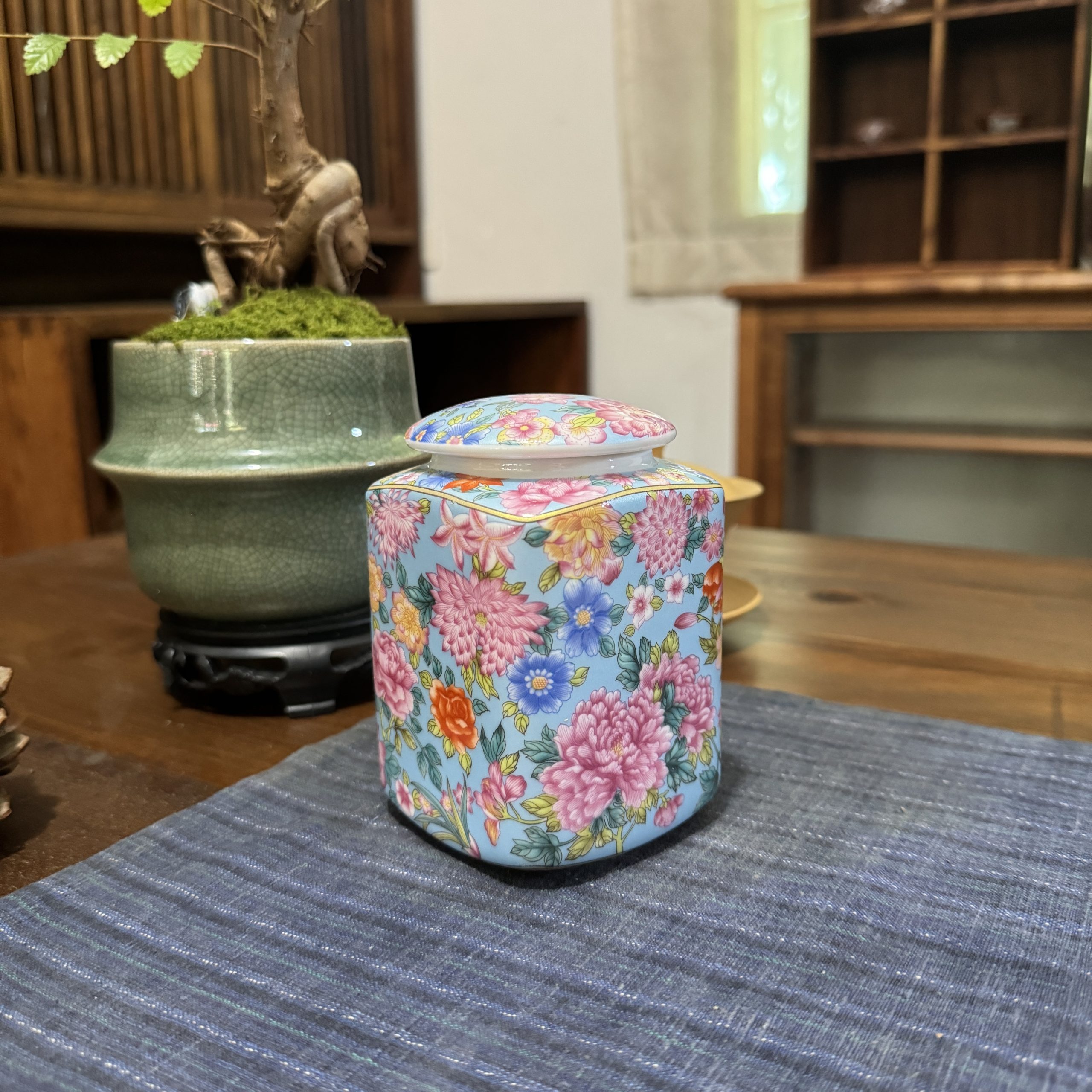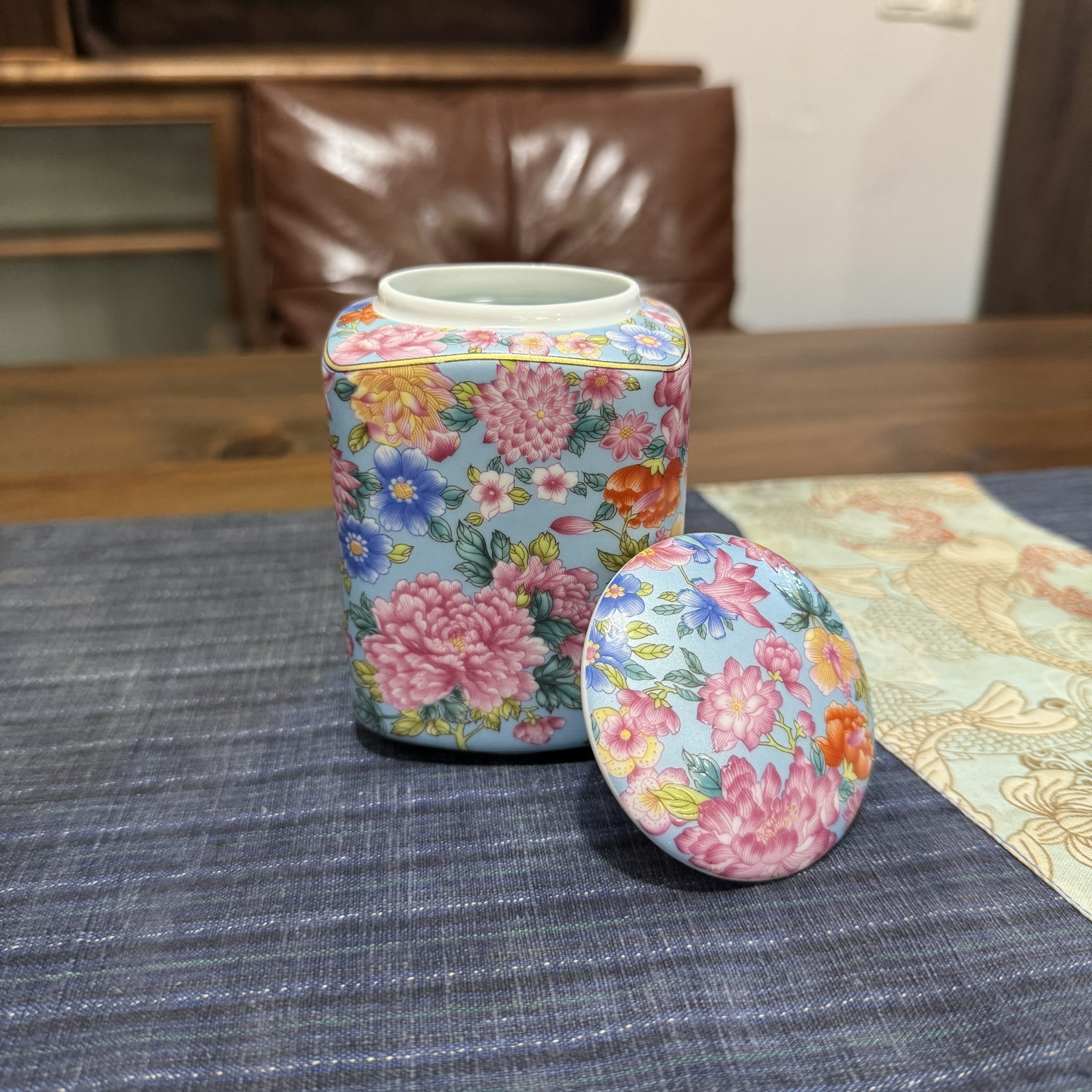 Elevate your tea storage or decor with this Chinese ceramic jar, featuring vibrant colorful floral patterns on a light blue background. Perfect for keeping tea fresh while adding traditional oriental charm.
