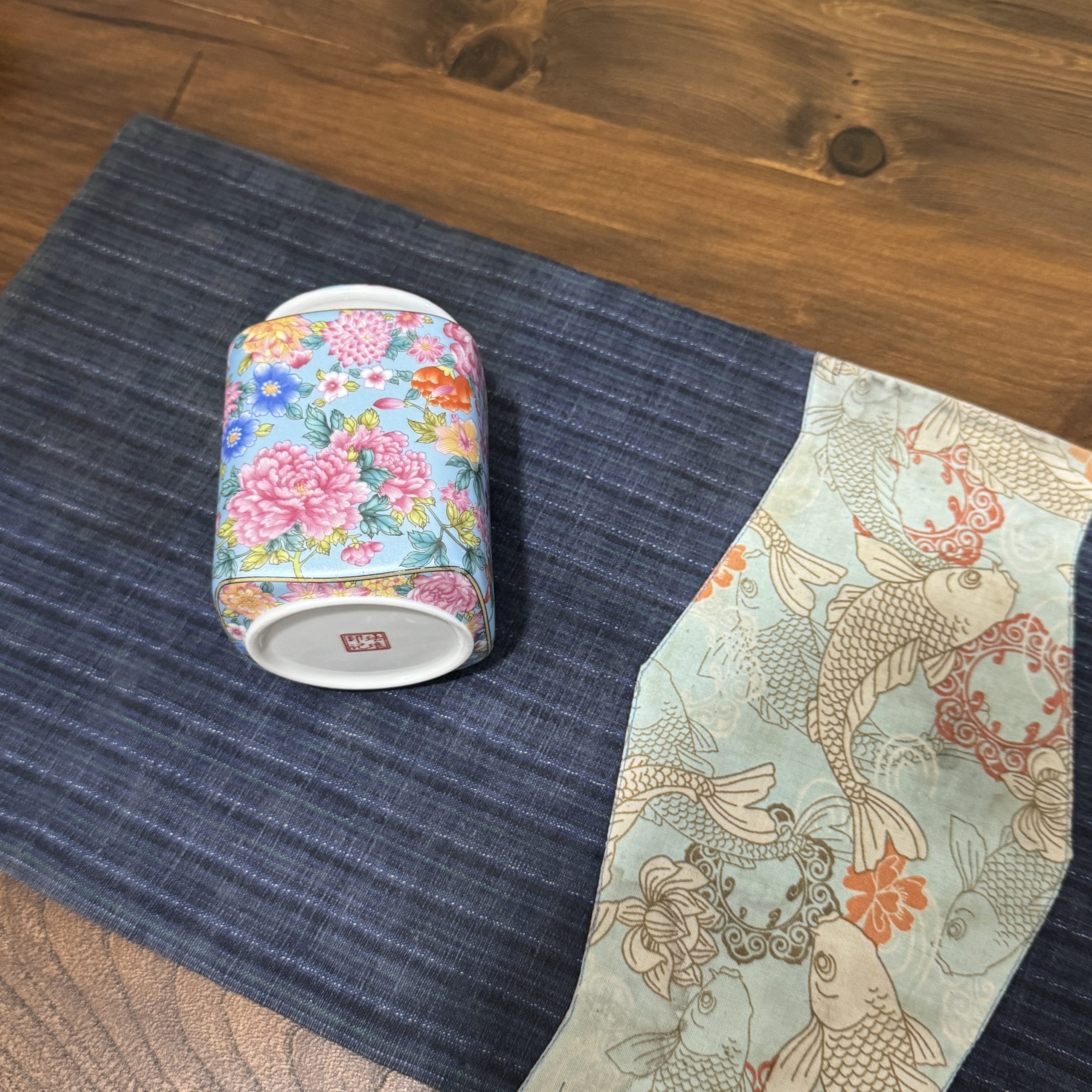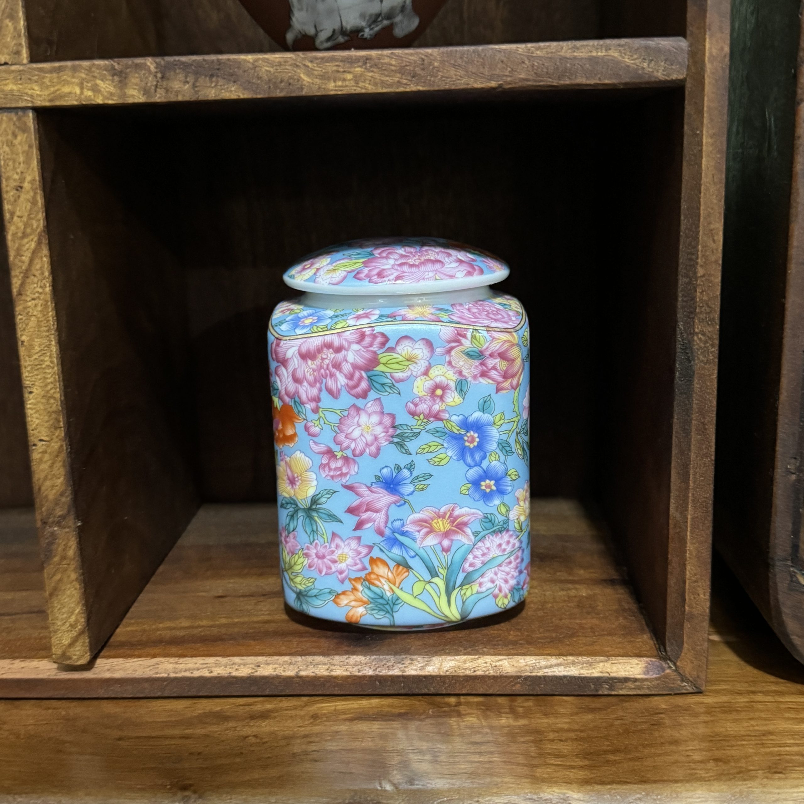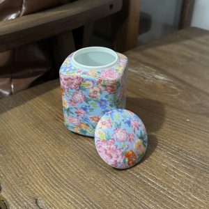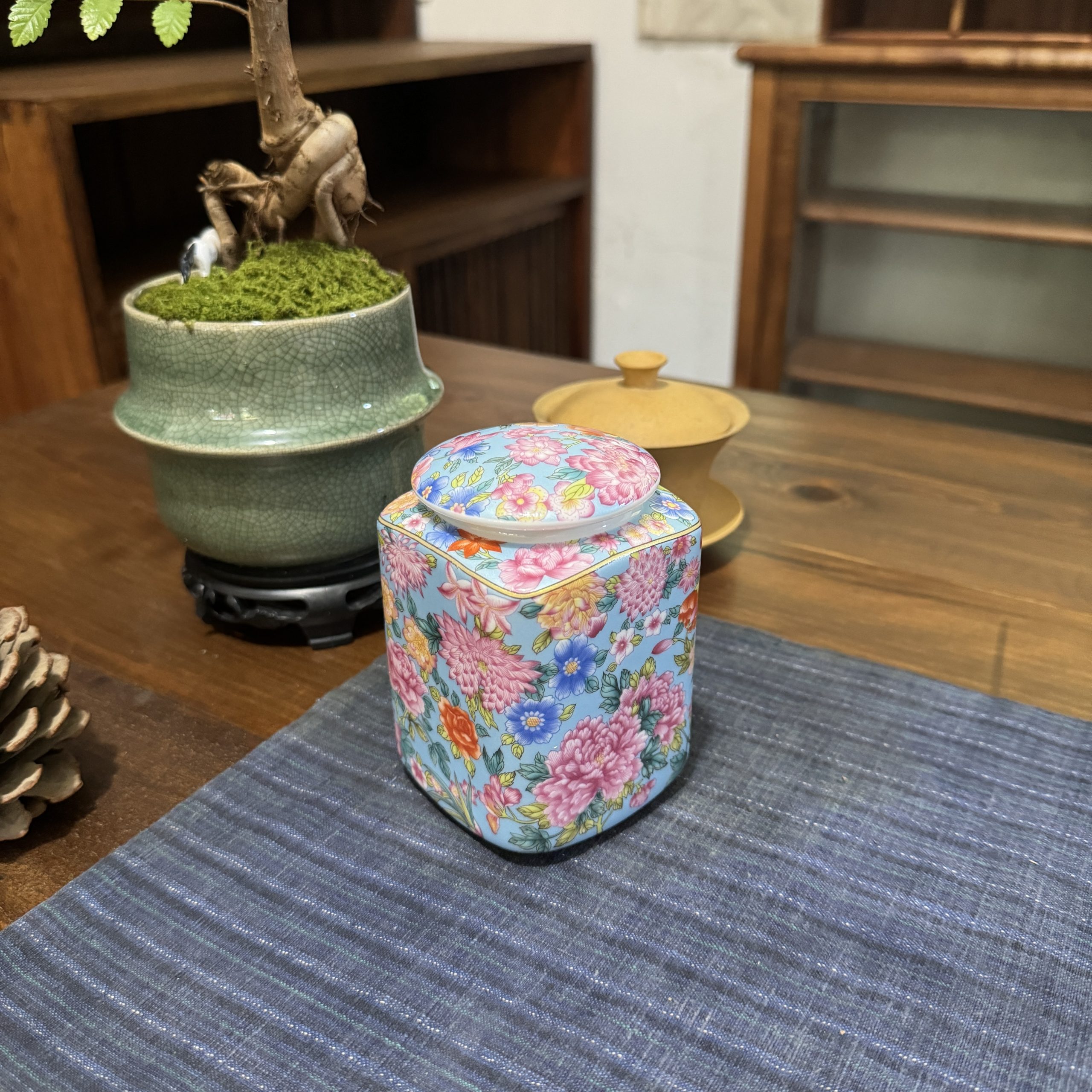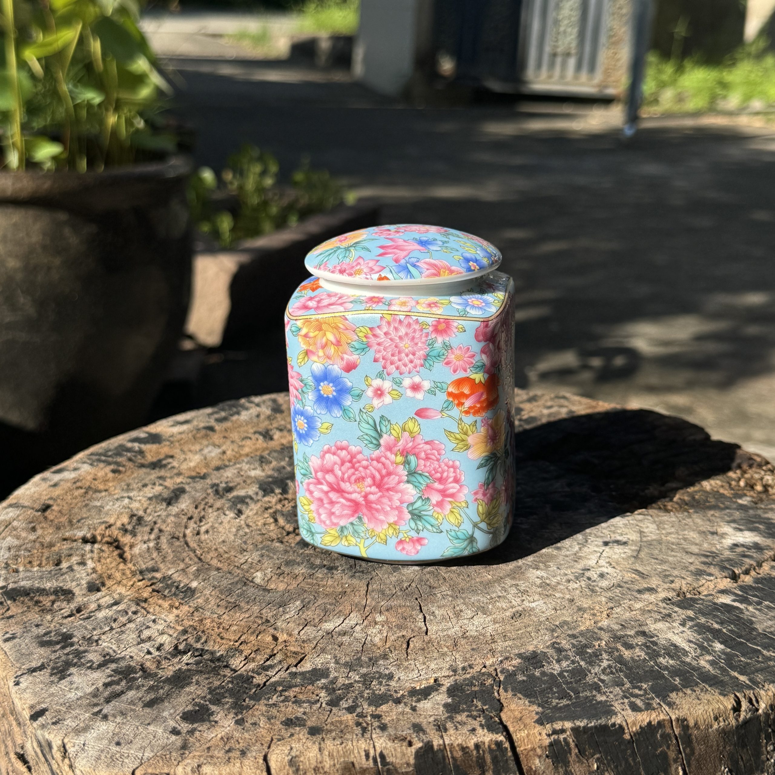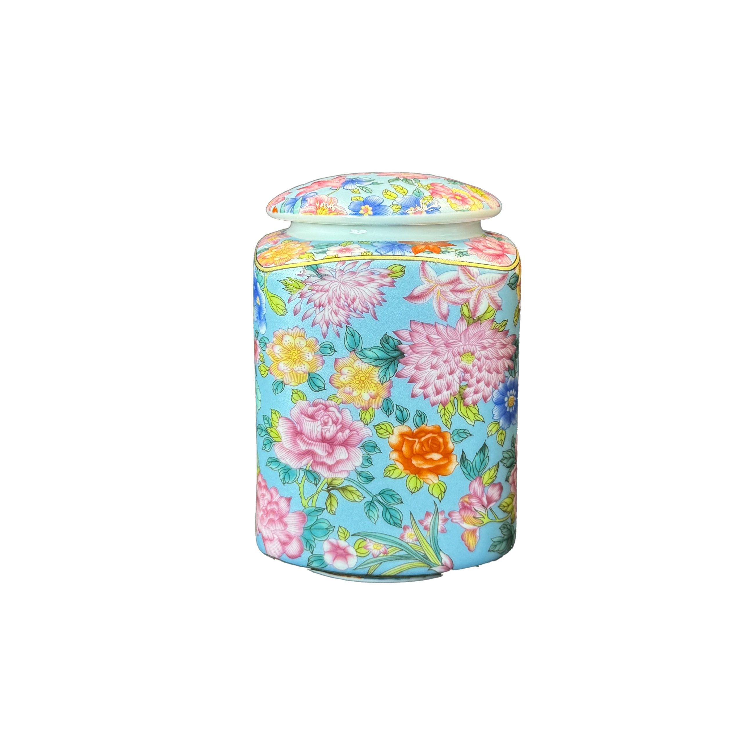 Chinese Ceramic Tea Storage Jar with Colorful Floral Pattern on Light Blue Background