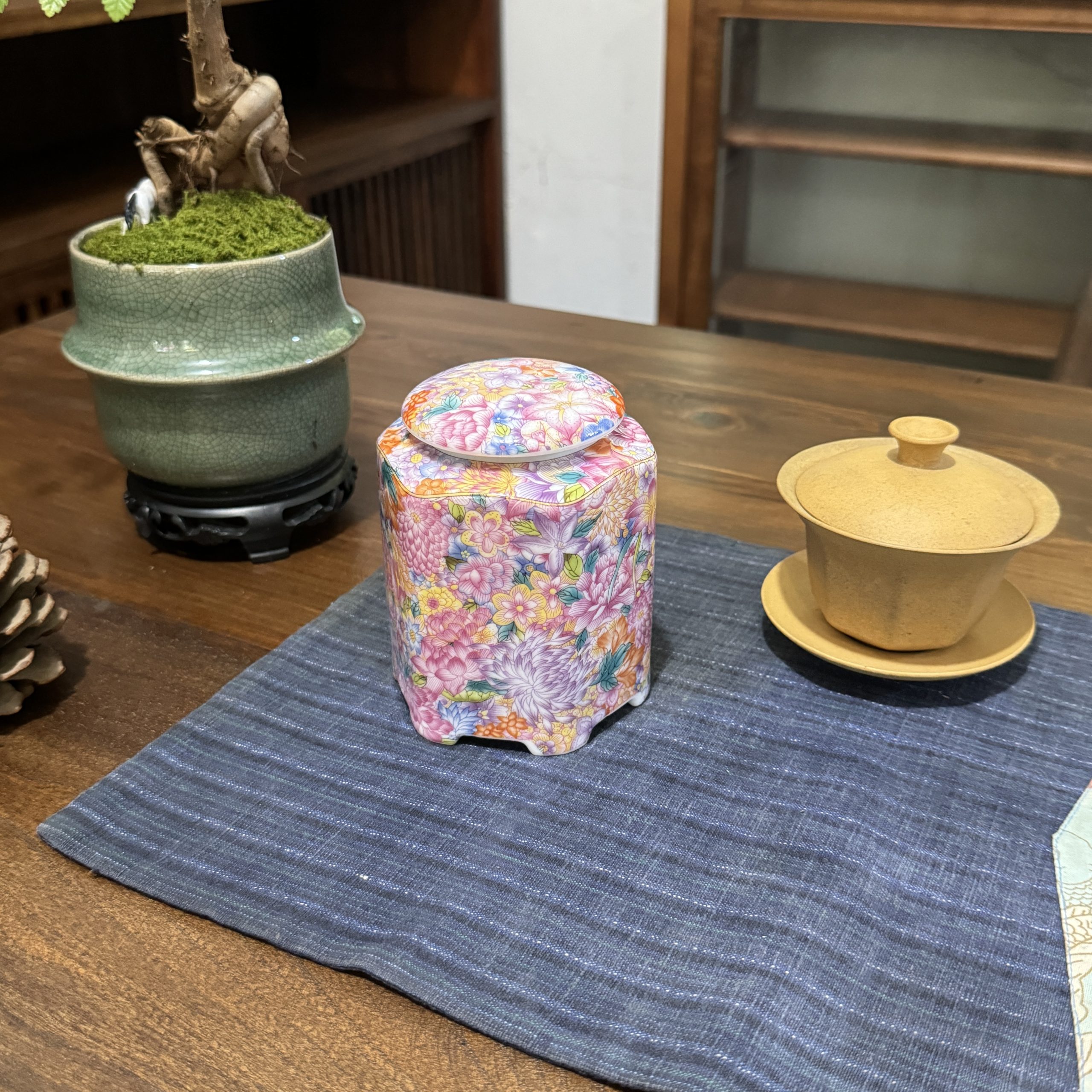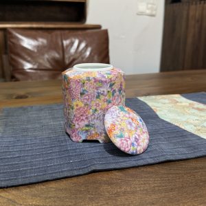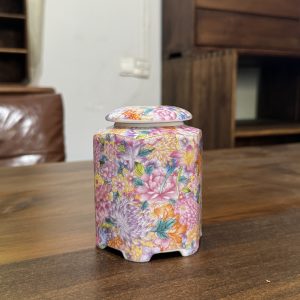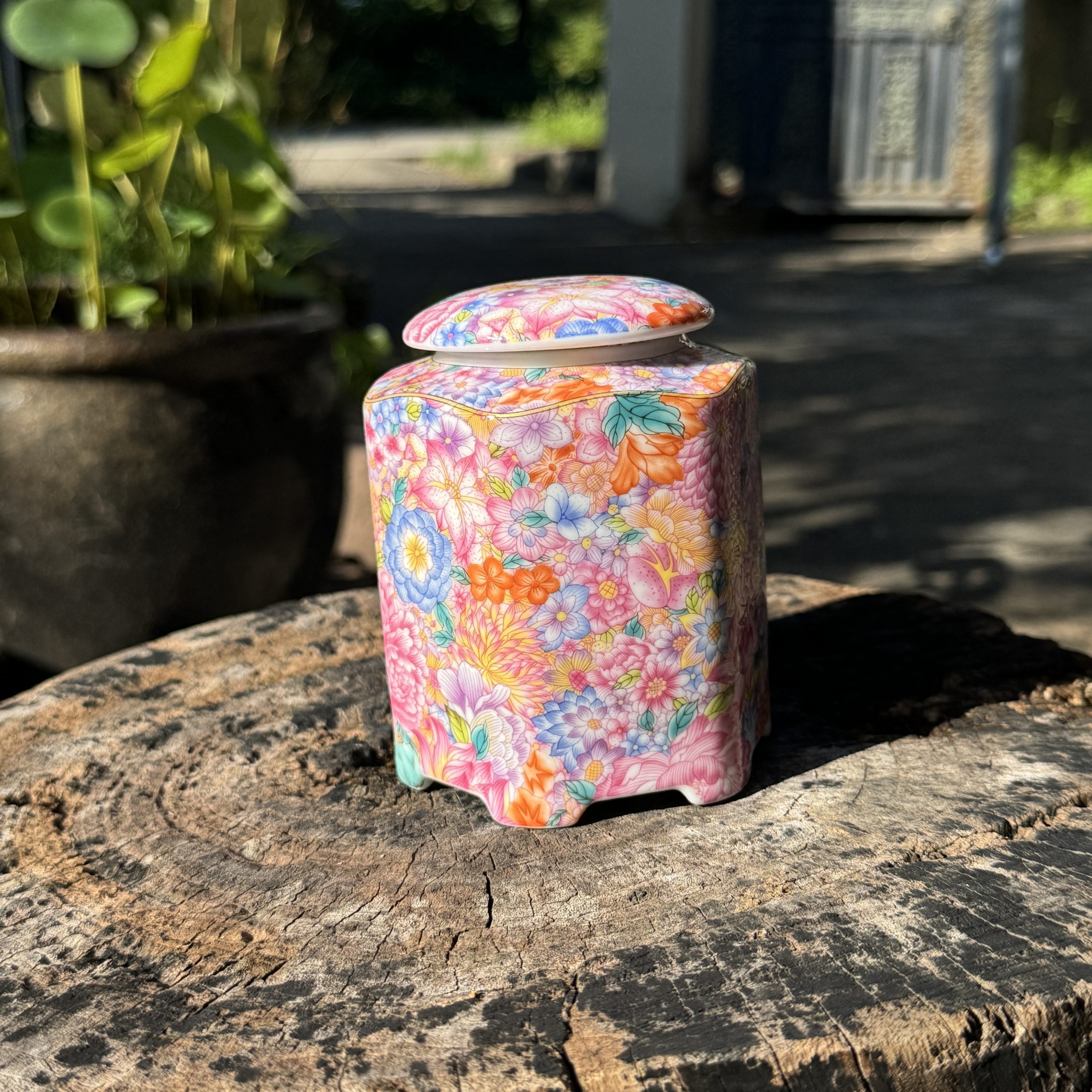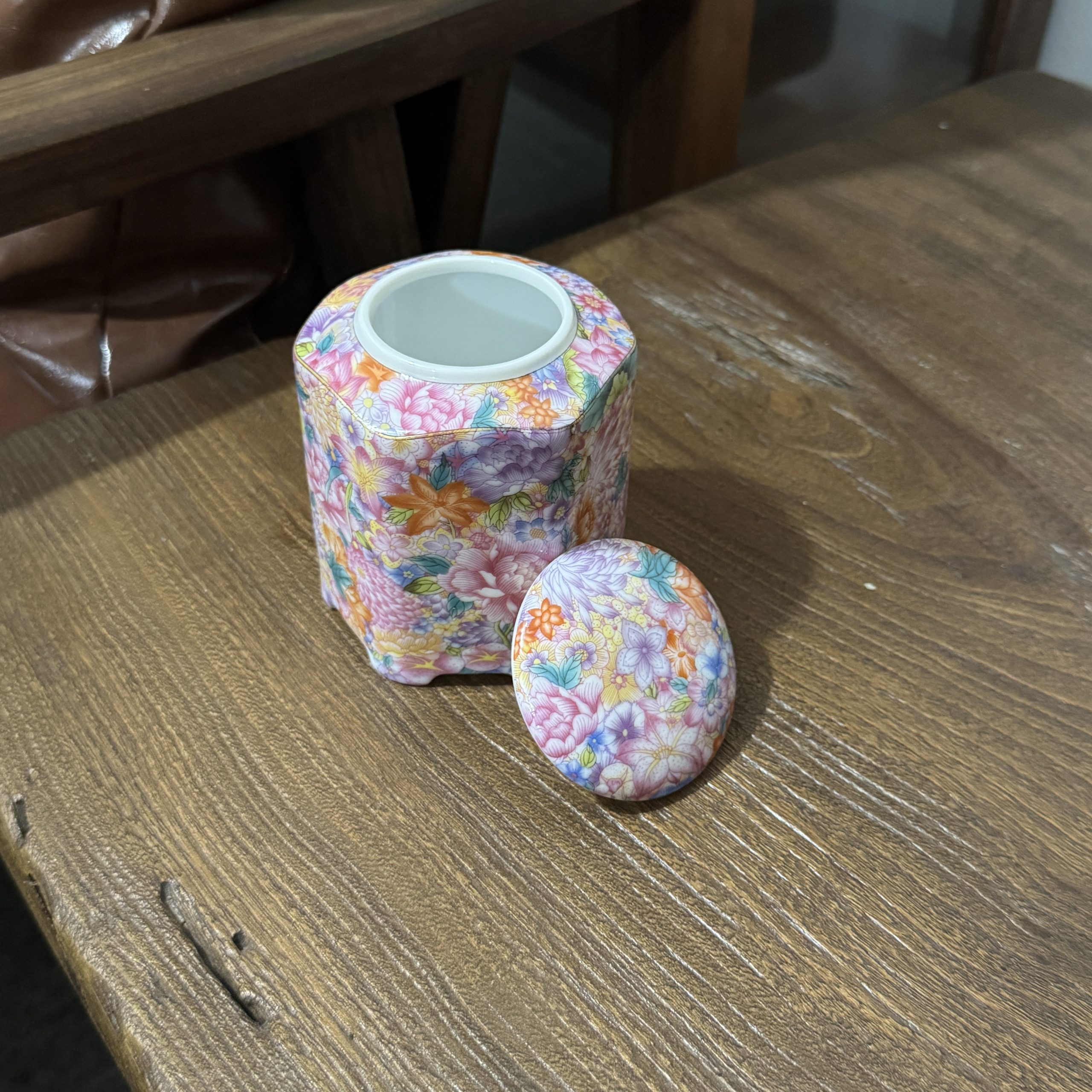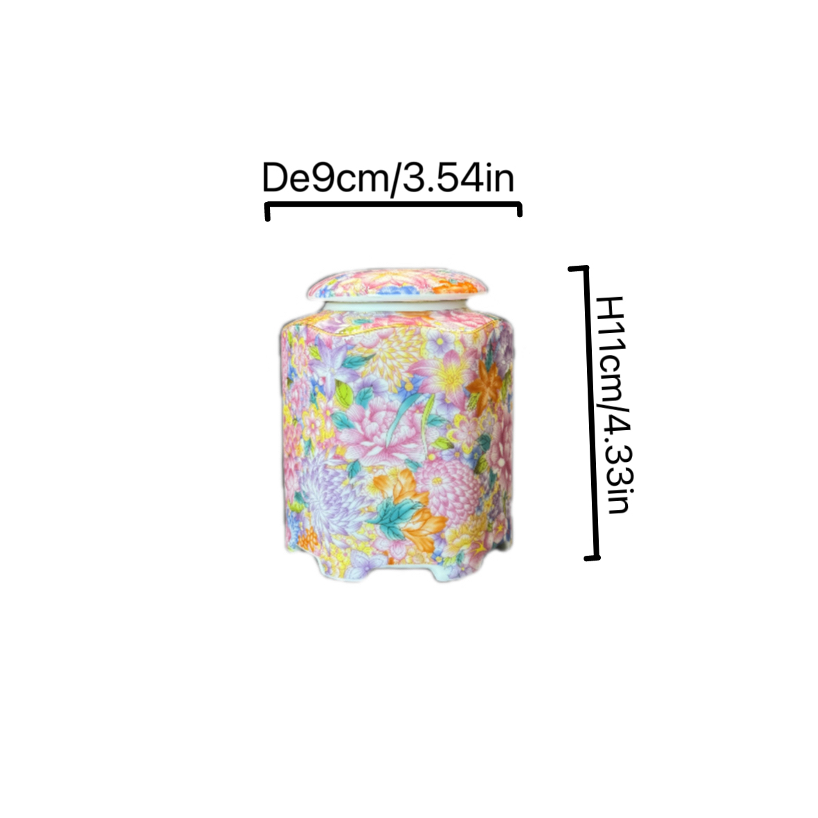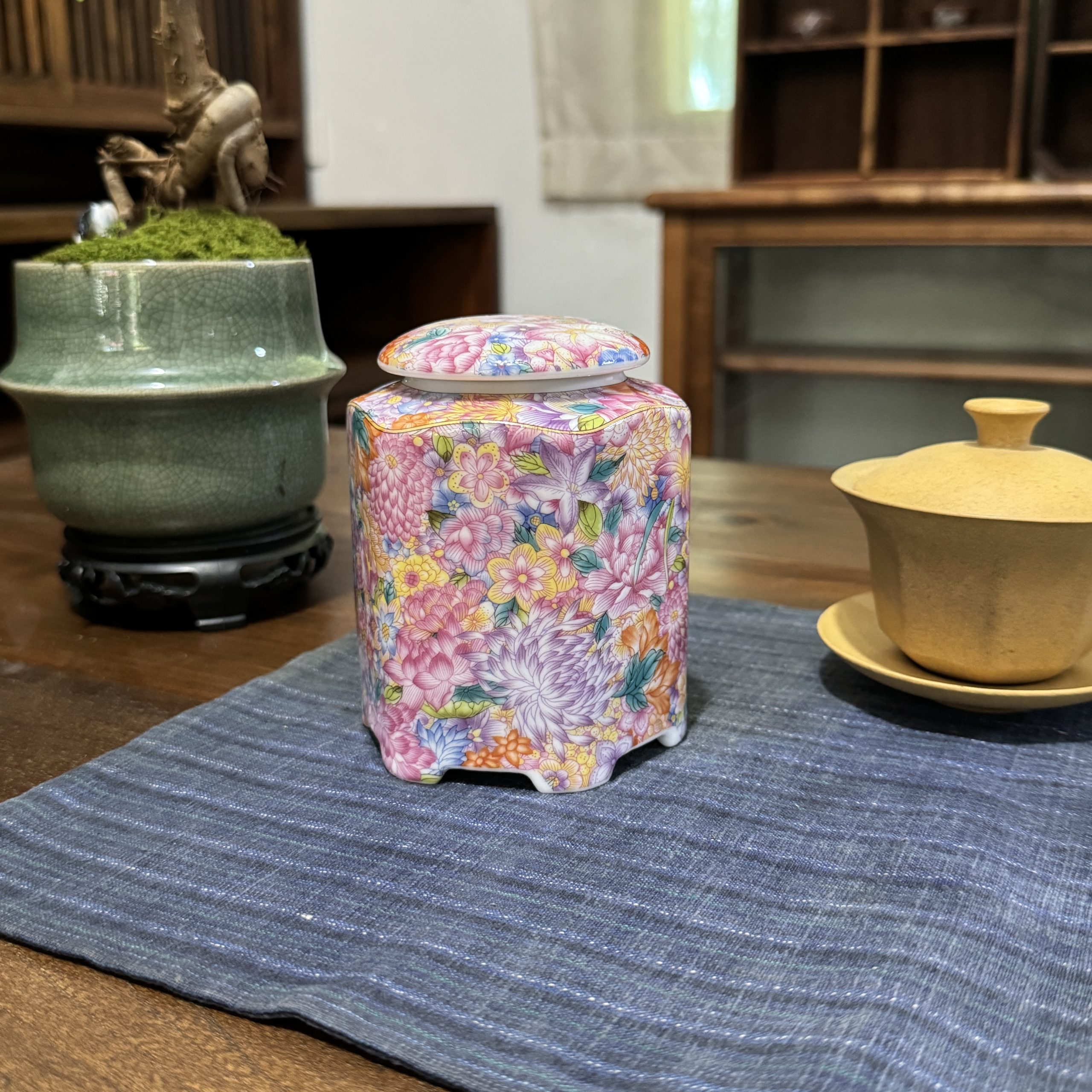 Elevate your tea storage with this Chinese ceramic jar featuring vibrant colorful hundred flowers patterns. Perfect for preserving tea freshness while adding traditional oriental charm to your space.