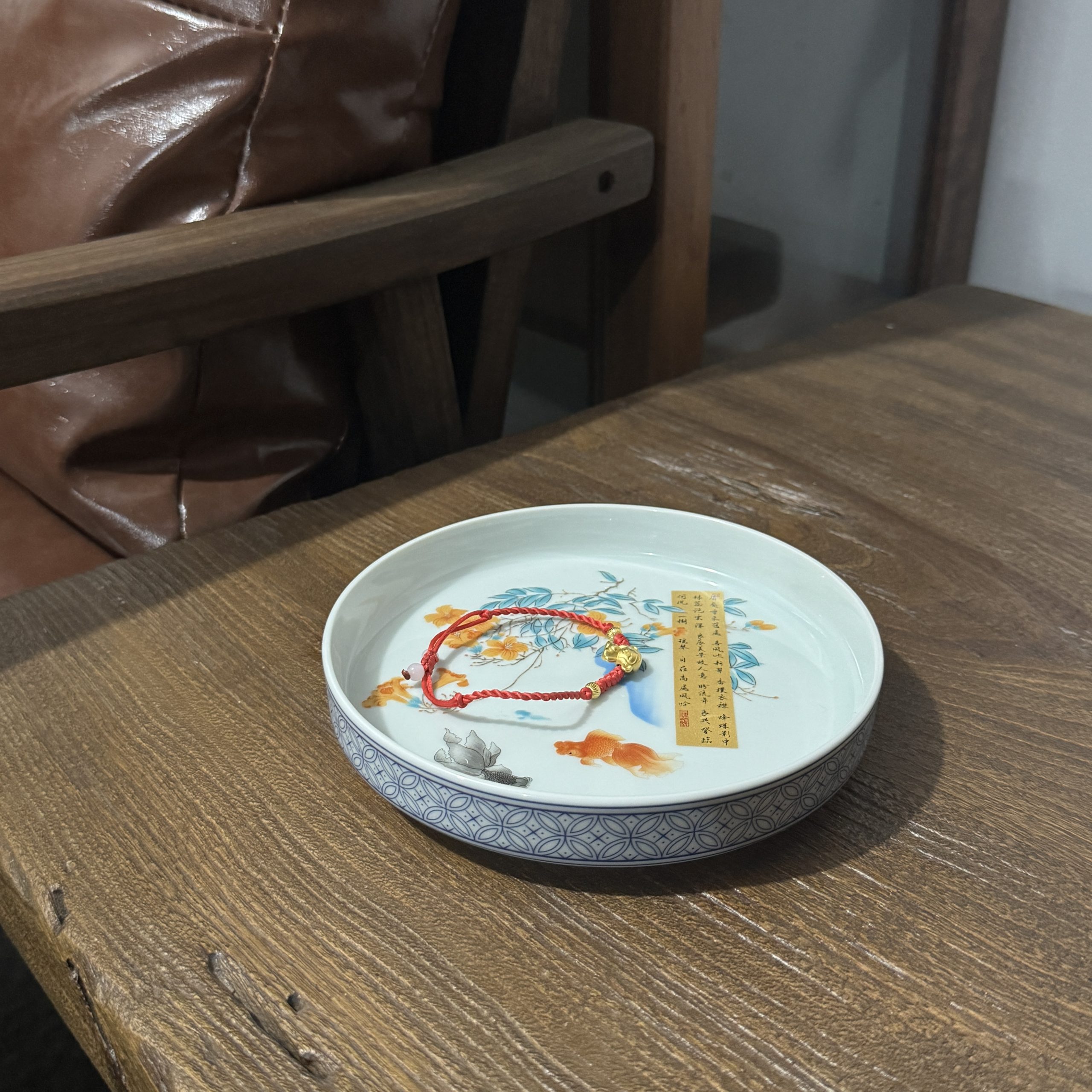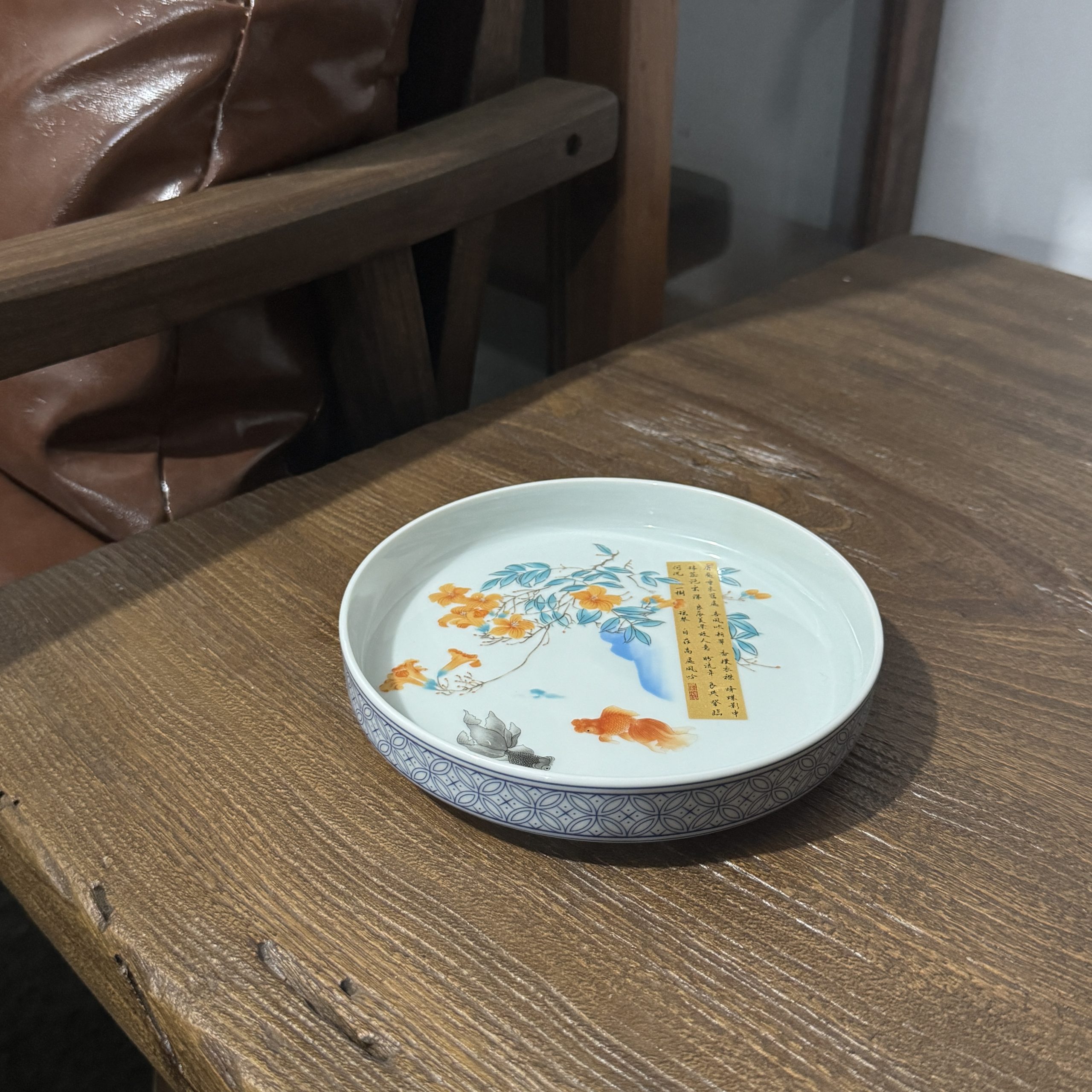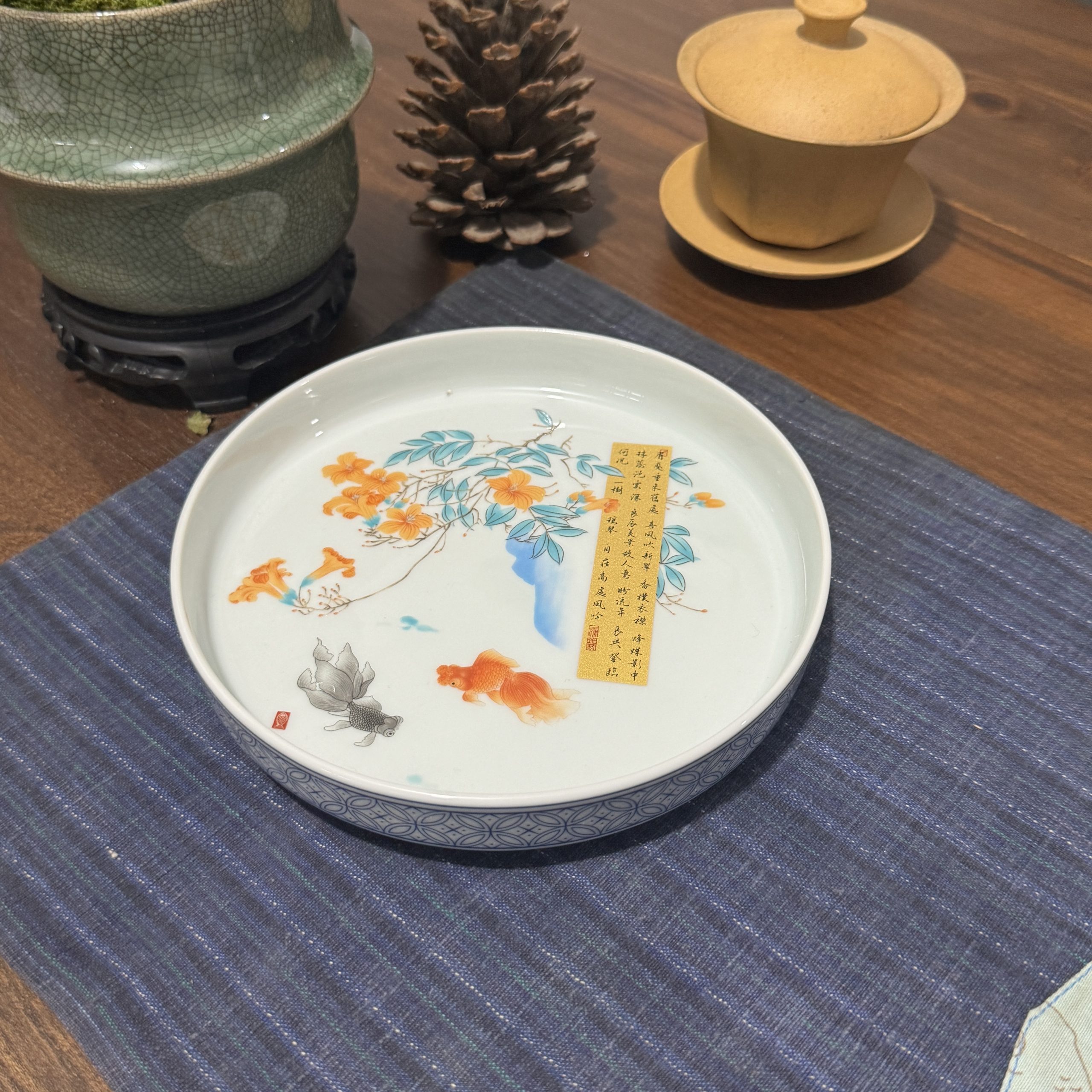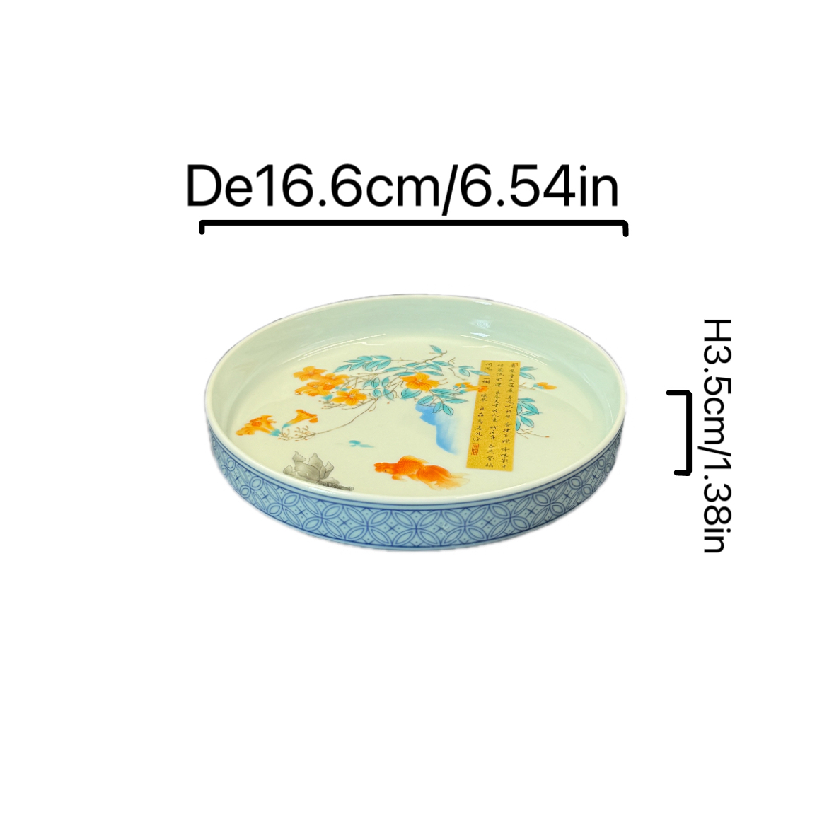Add traditional Chinese charm to your space with this ceramic tray, featuring goldfish, floral designs, and calligraphy. Perfect for home decor or tea ceremony setups.