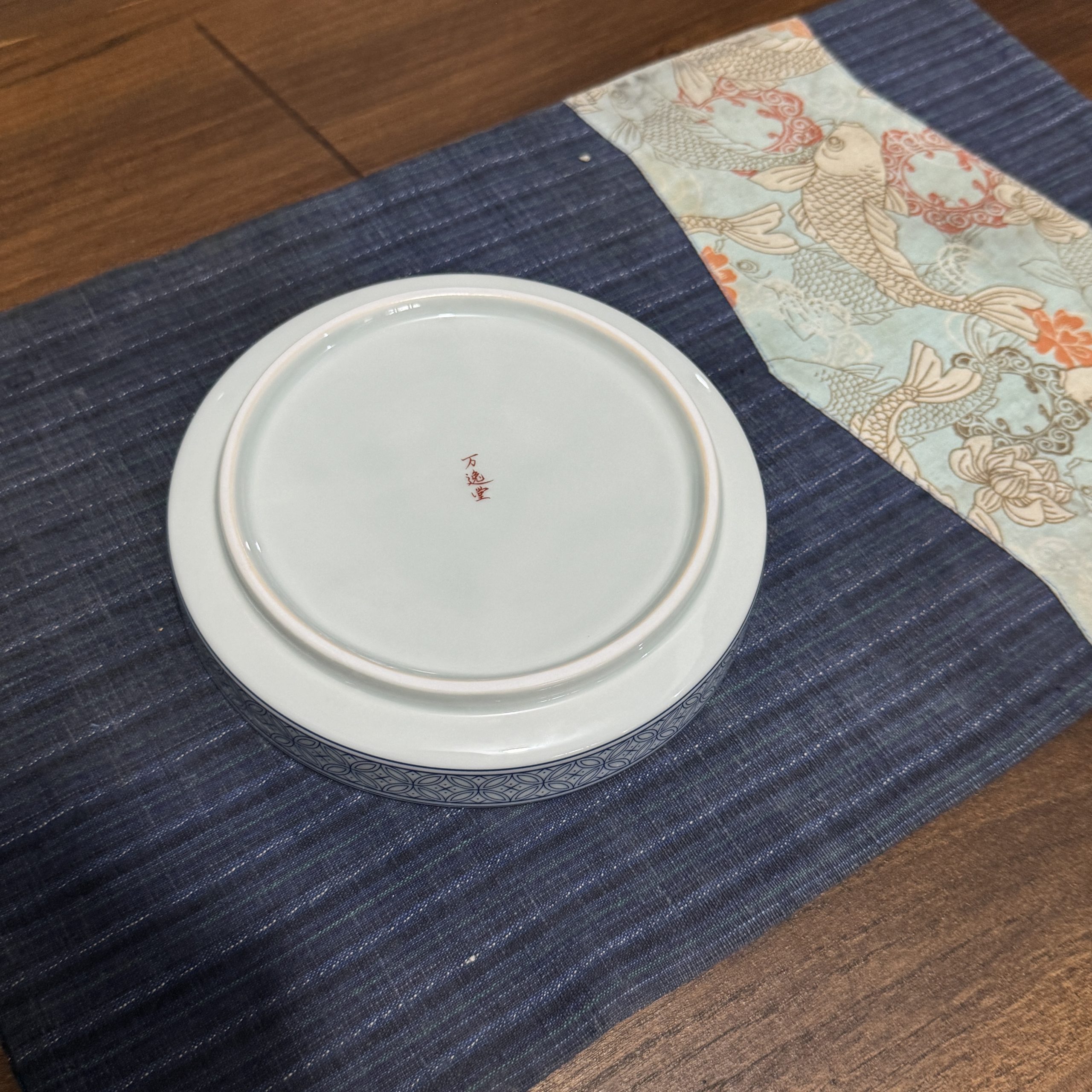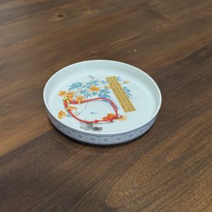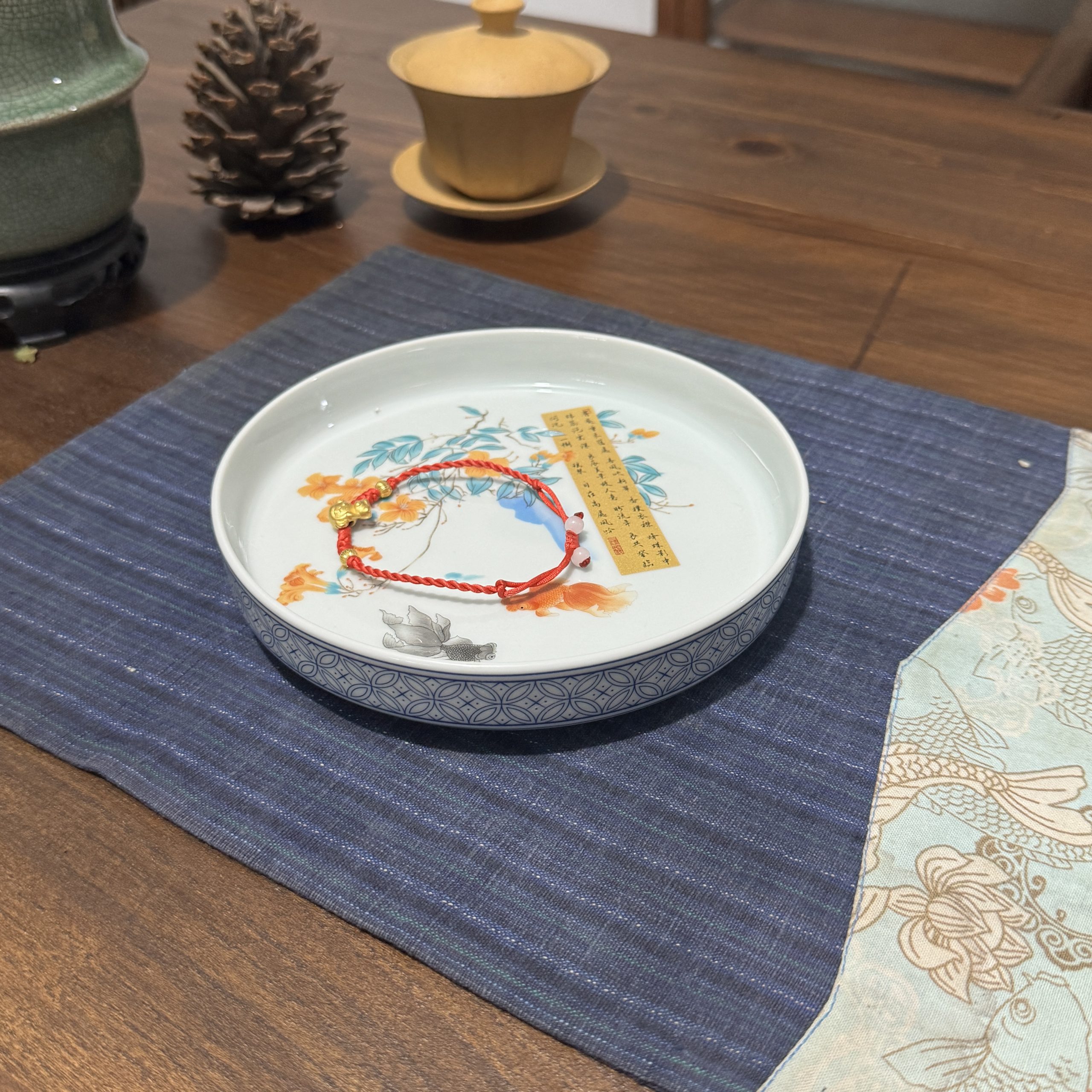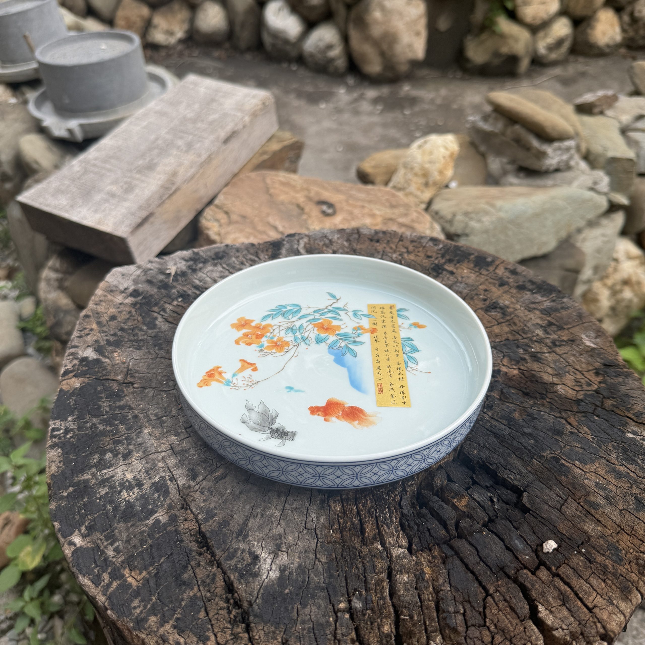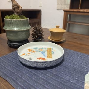 Add traditional Chinese charm to your space with this ceramic tray, featuring goldfish, floral designs, and calligraphy. Perfect for home decor or tea ceremony setups.