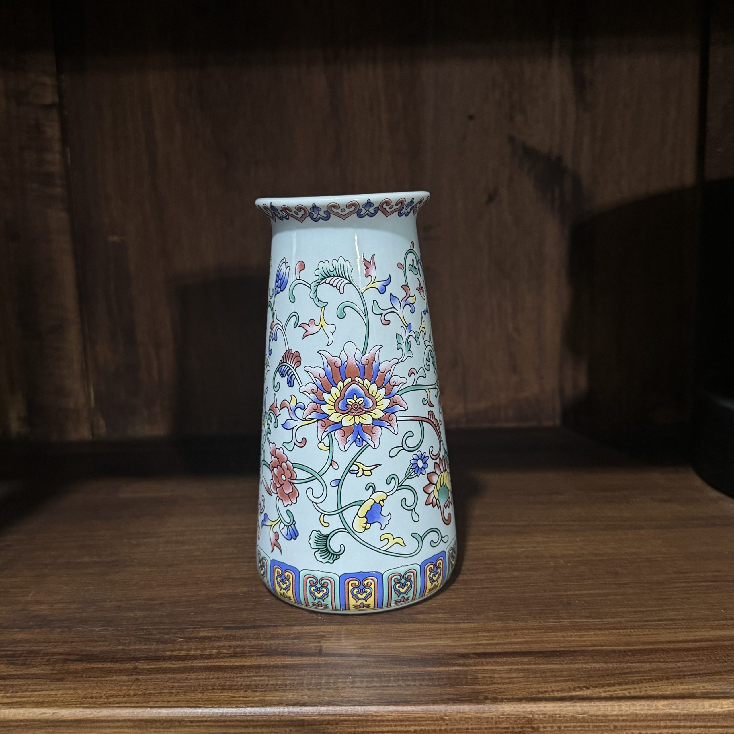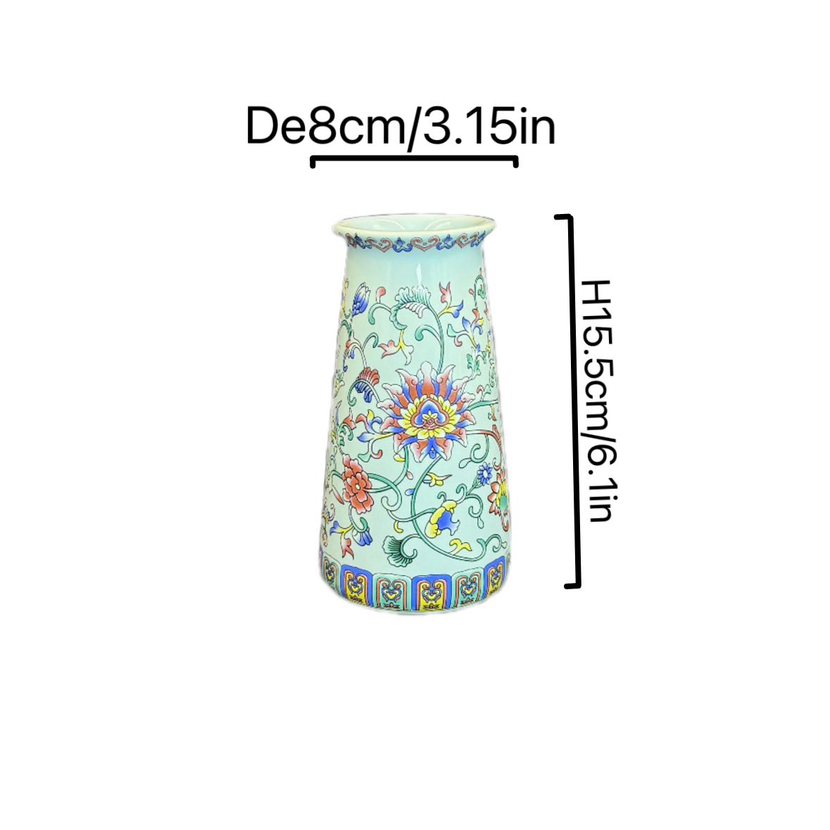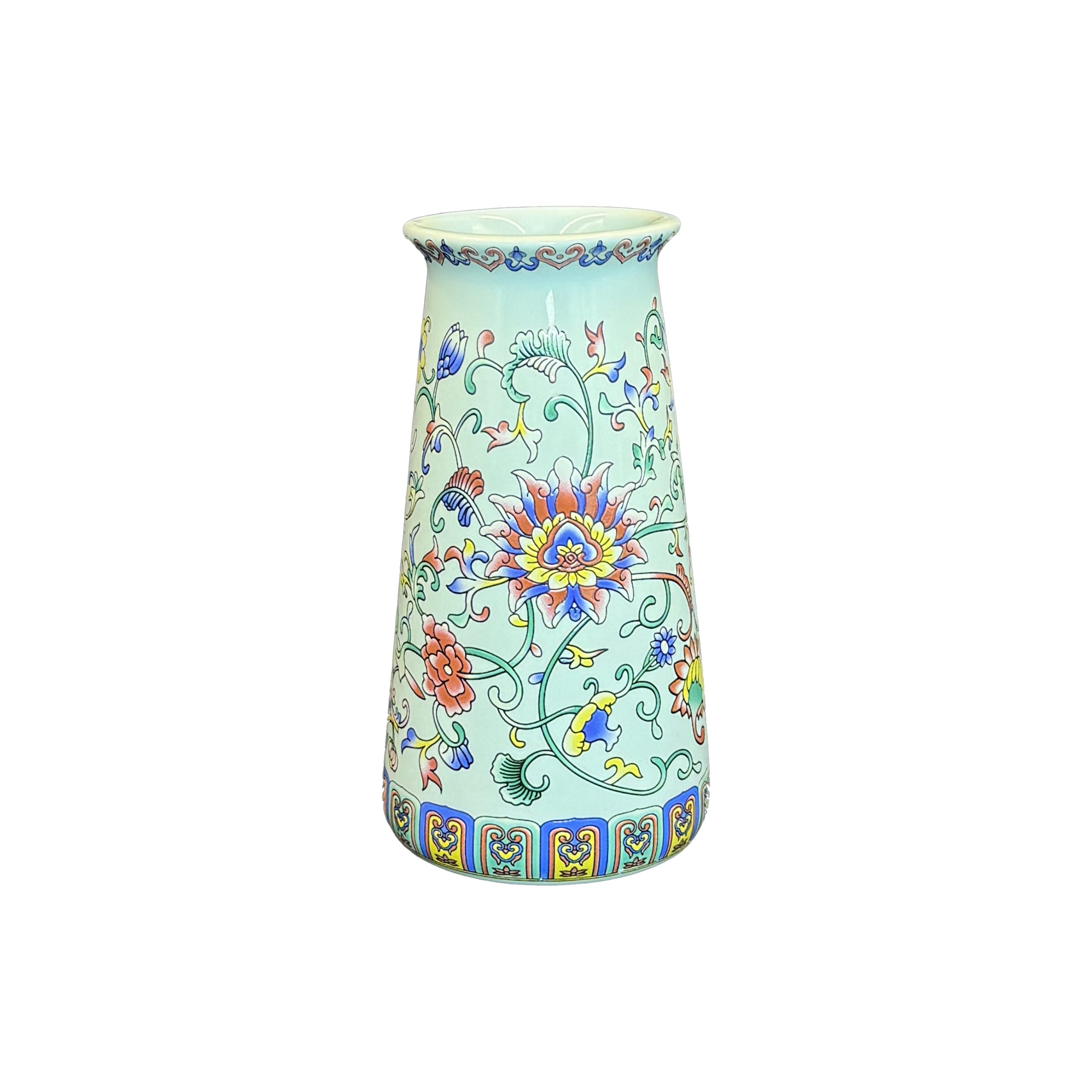 Add a touch of traditional Chinese elegance to your space with this light cyan ceramic vase, featuring vibrant colorful floral patterns. Perfect for flower displays or as a decorative accent.