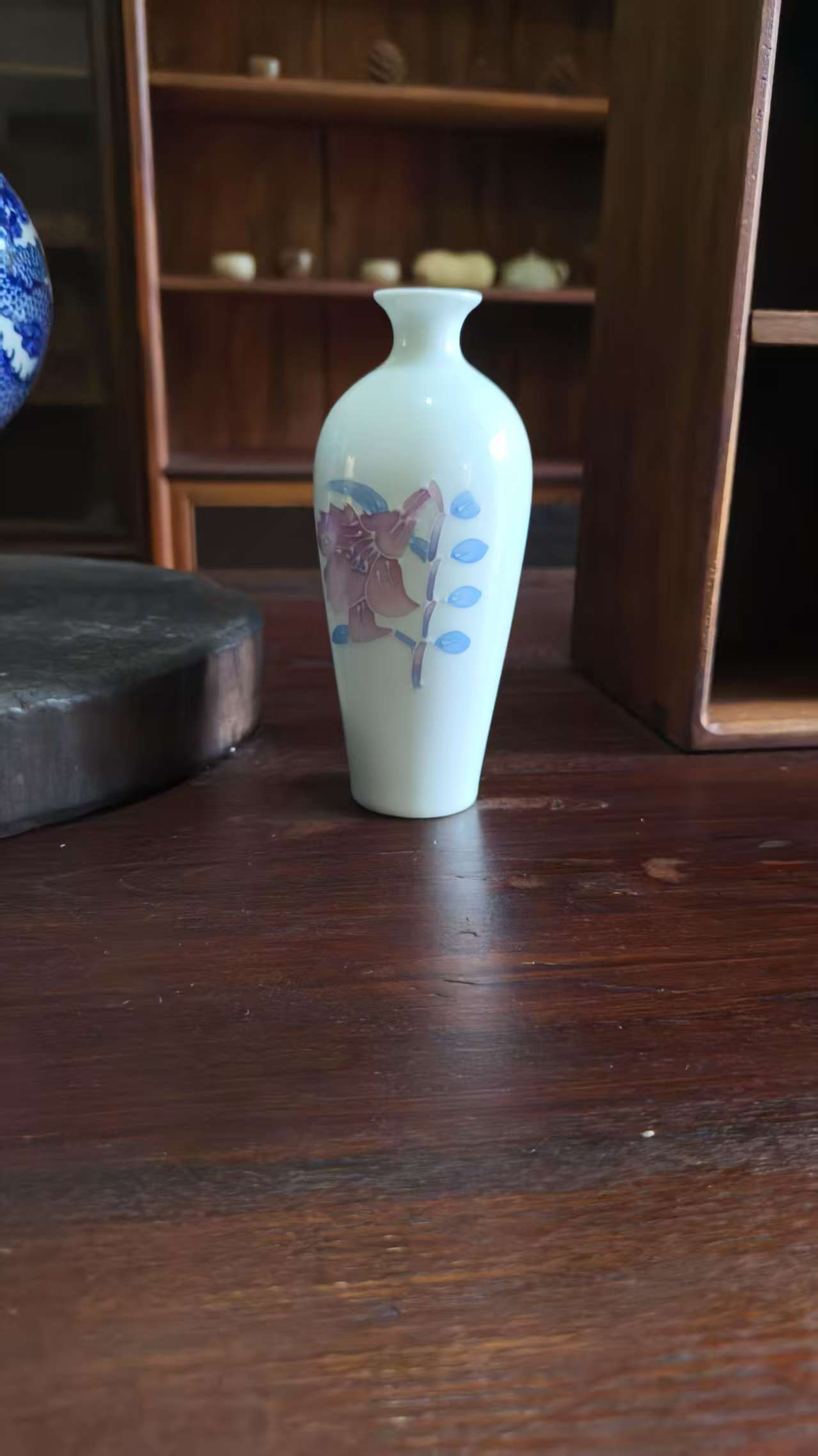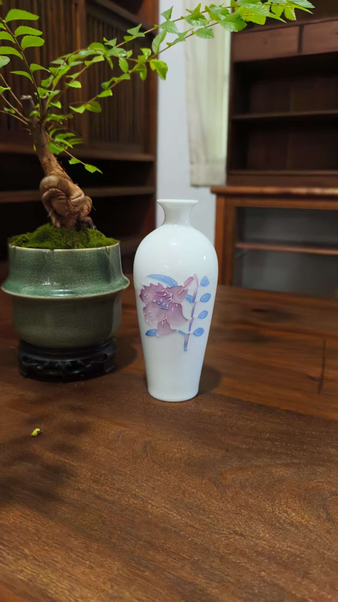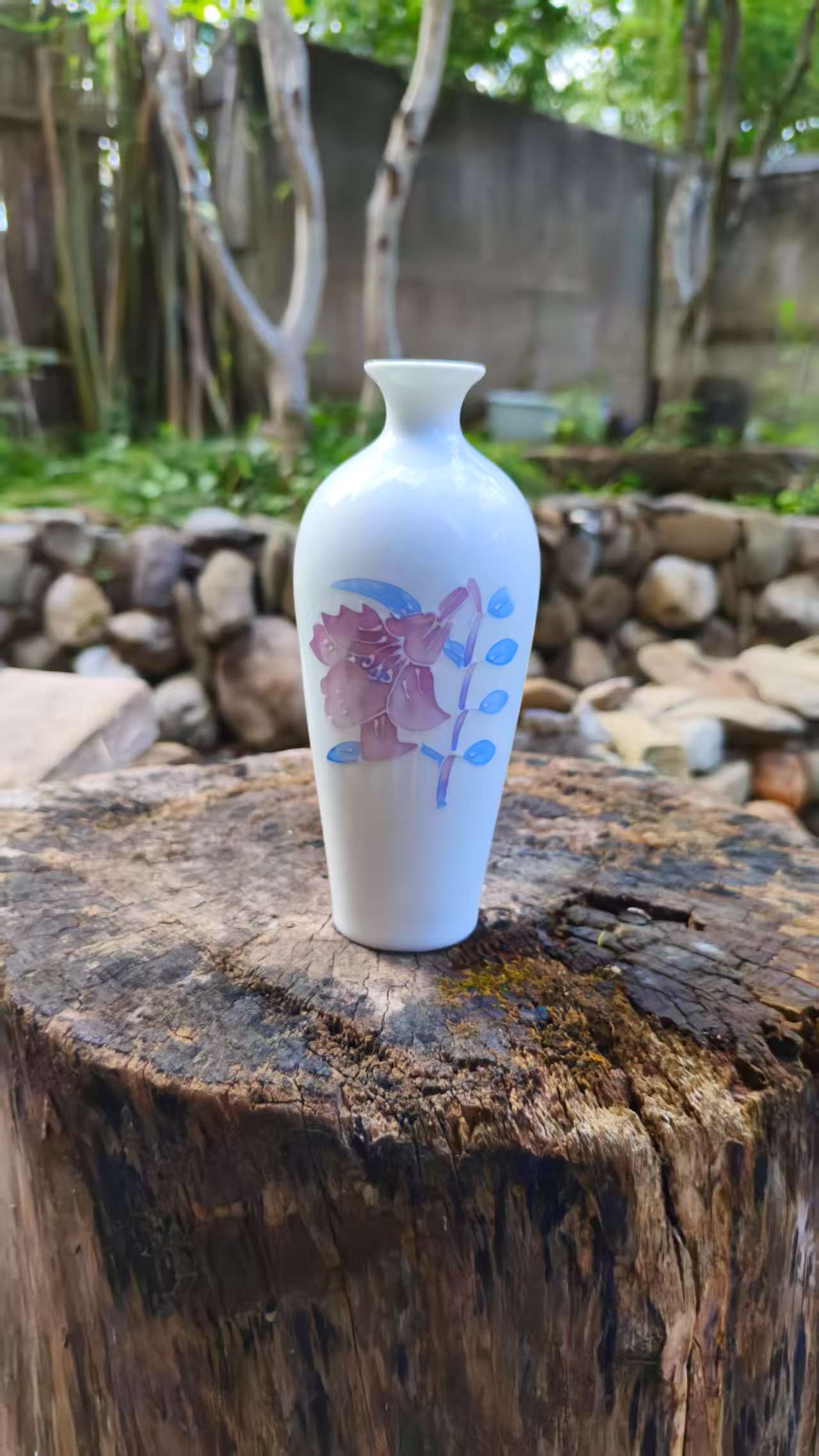 Add a touch of refined elegance to your space with this white ceramic vase featuring delicate pink – purple floral and blue leaf patterns. Perfect for flower displays or as a decorative accent.
