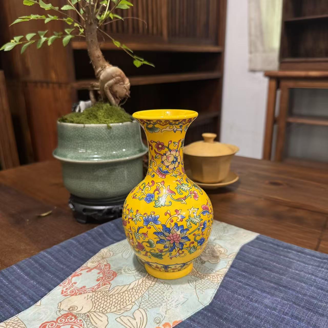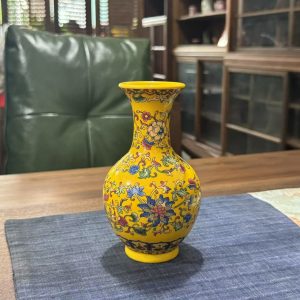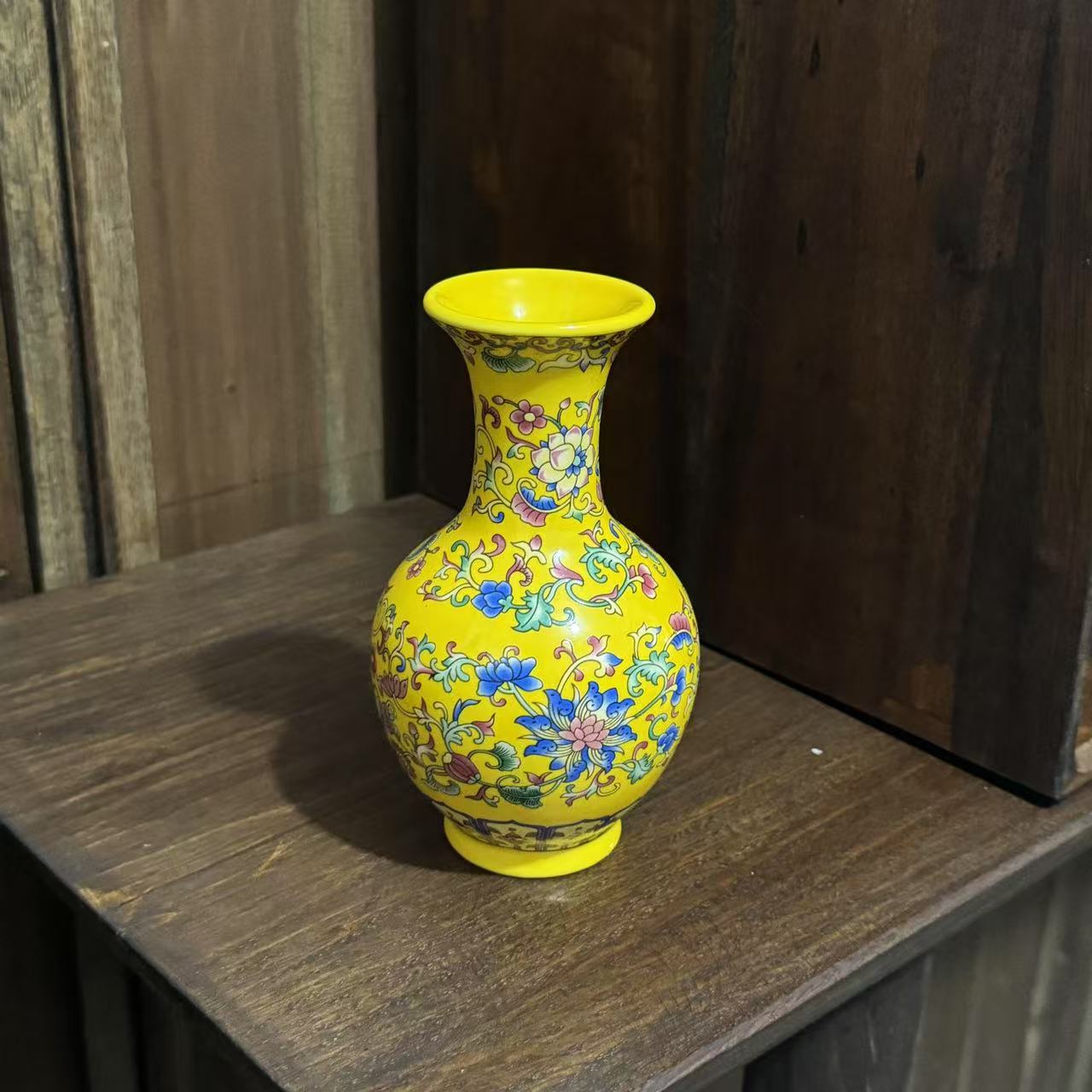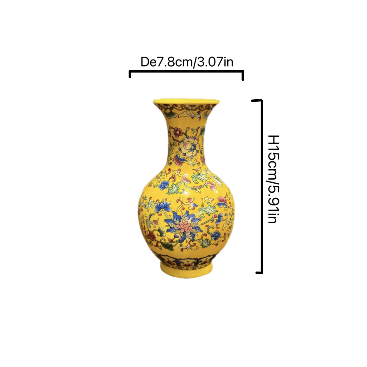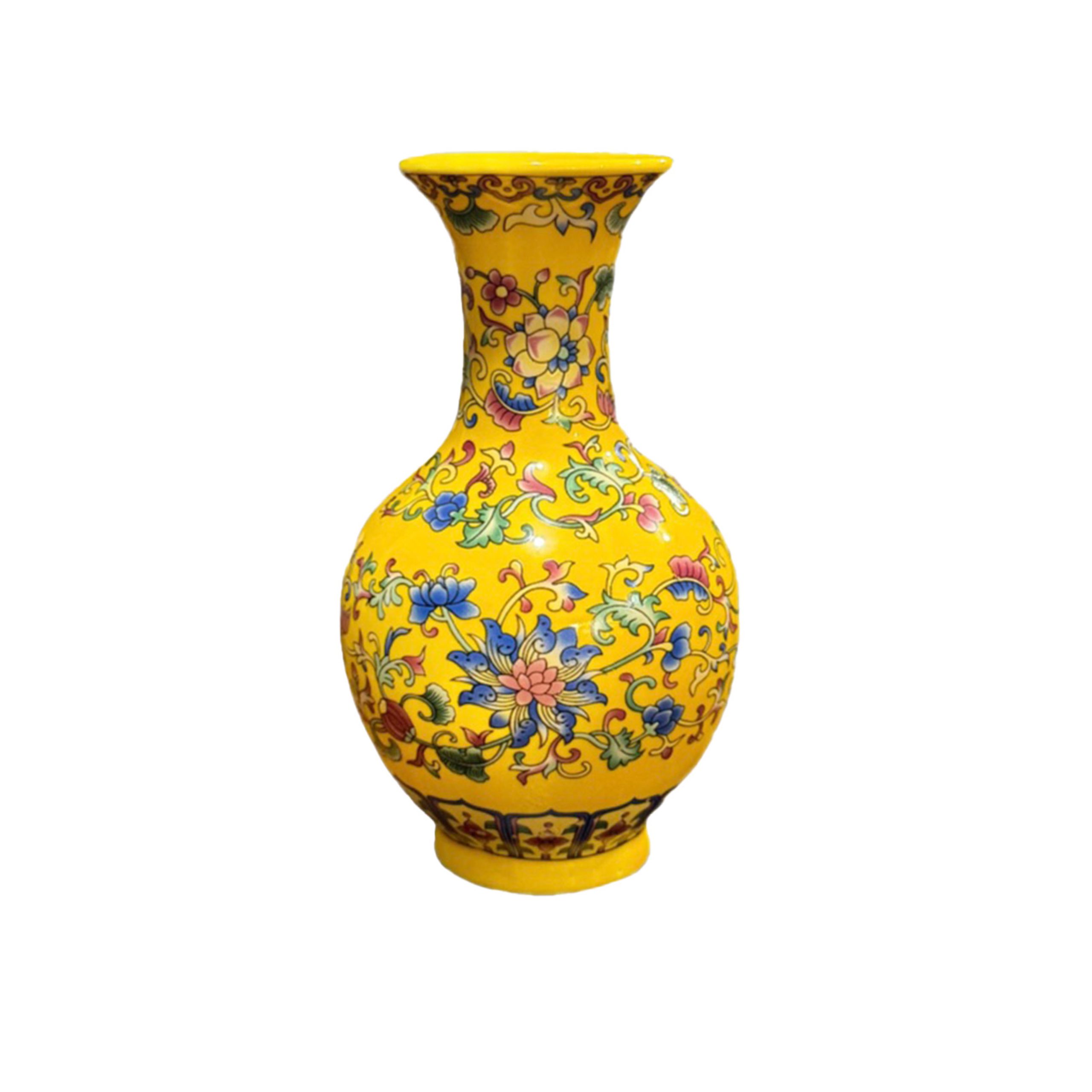 Elevate your space with this vibrant yellow ceramic vase featuring exquisite colorful floral patterns. Perfect for flower displays or as a decorative accent.
